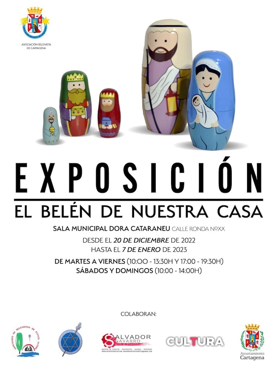 Se inaugura hoy en la sala municipal Dora Cataraneu, en la calle Ronda de la ciudad, entre plaza Juan XXIII y Mercado de Santa Florentina. Organiza la Asociación Belenista de Cartagena con la colaboración de los colectivos belenistas de Fuente Álamo y ’José de Nazaret y de los artesanos Salvador Navarro ‘Cuco’ y Paco Alarte.