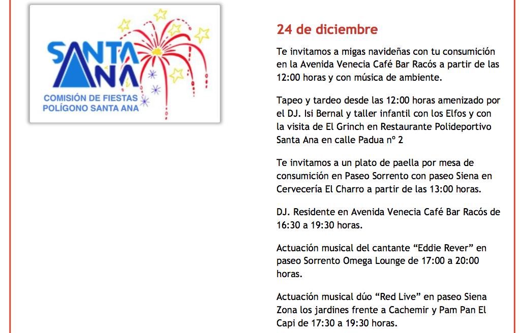 Las actividades del día de Nochebuena se distribuyen en la barriada de Cartagena Norte de 12 a 21 horas, destacando la presencia del duende al que no le gusta la Navidad, un taller con elfos y las actuaciones de djs junto a ‘Eddie Rever’ y ‘Rd Live’, entre otros atractivos.