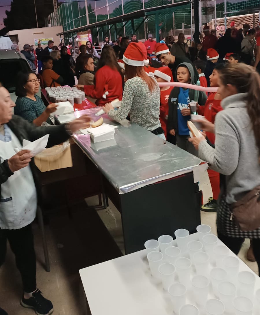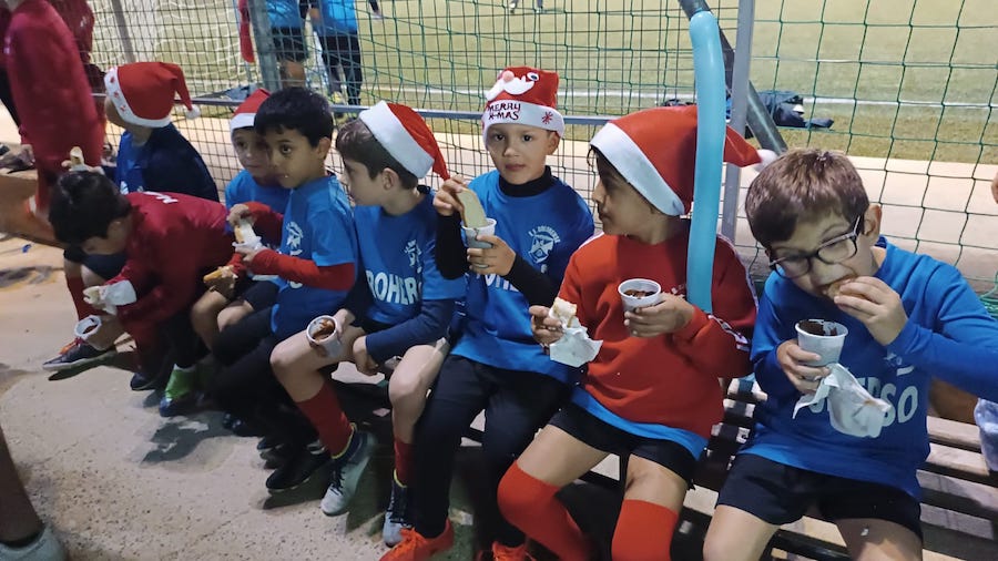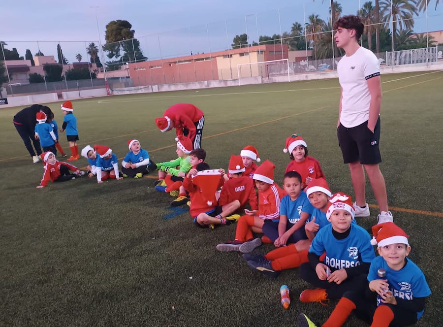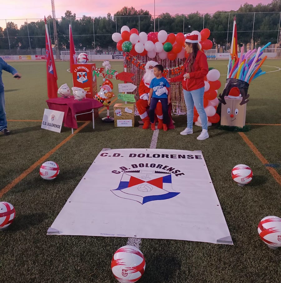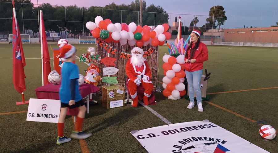 El club deportivo de la Barriada de Hispanoamérica-Los Dolores lleva recibiendo al popular personaje navideño más de dos décadas. Esta semana ha vuelto a tener el entrañable encuentro con los chavales sobre el césped del campo San Juan Bosco en una tarde que culminó con una sabrosa chocolatada con bollos.