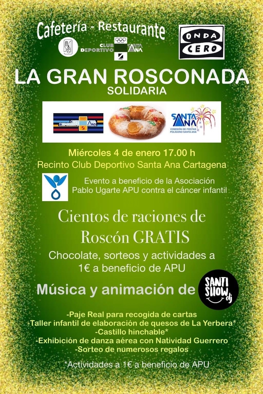El club deportivo de la barriada cartagenero acoge esta tarde, a partir de las 17 horas, una fiesta con música y animaciones, junto a cientos de raciones gratuitas. Estará el paje real para recoger las cartas, habrá un taller infantil de elaboración de quesos La Yerbera, hinchable, danza aérea, sorteos… El dinero recogido será paera ayudar a la Asociación Pablo Ugarte, que lo destinará a la investigación del cáncer infantil.
