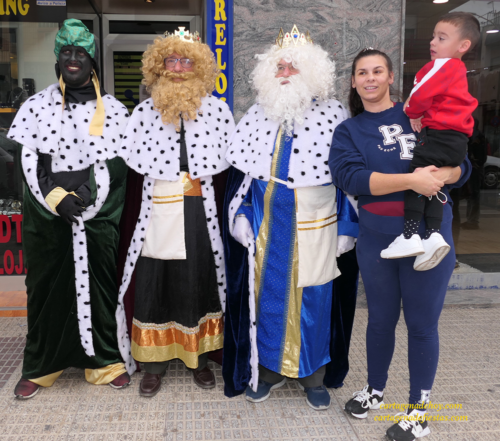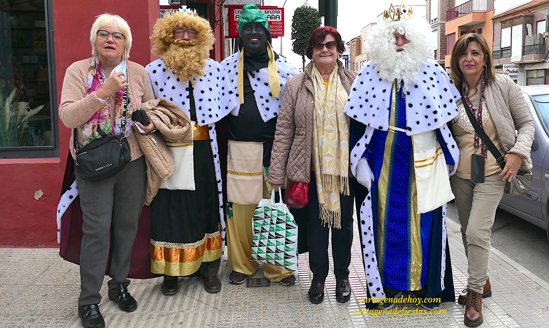 Melchor, Gaspar y Baltasar visitaron ayer por la mañana a los usuarios del centro de día de Los Dolores y después recorrieron la calle de Alfonso XIII, arteria principal del populoso barrio, en la que han sido objeto de numerosas fotografías con pequeños y mayores.