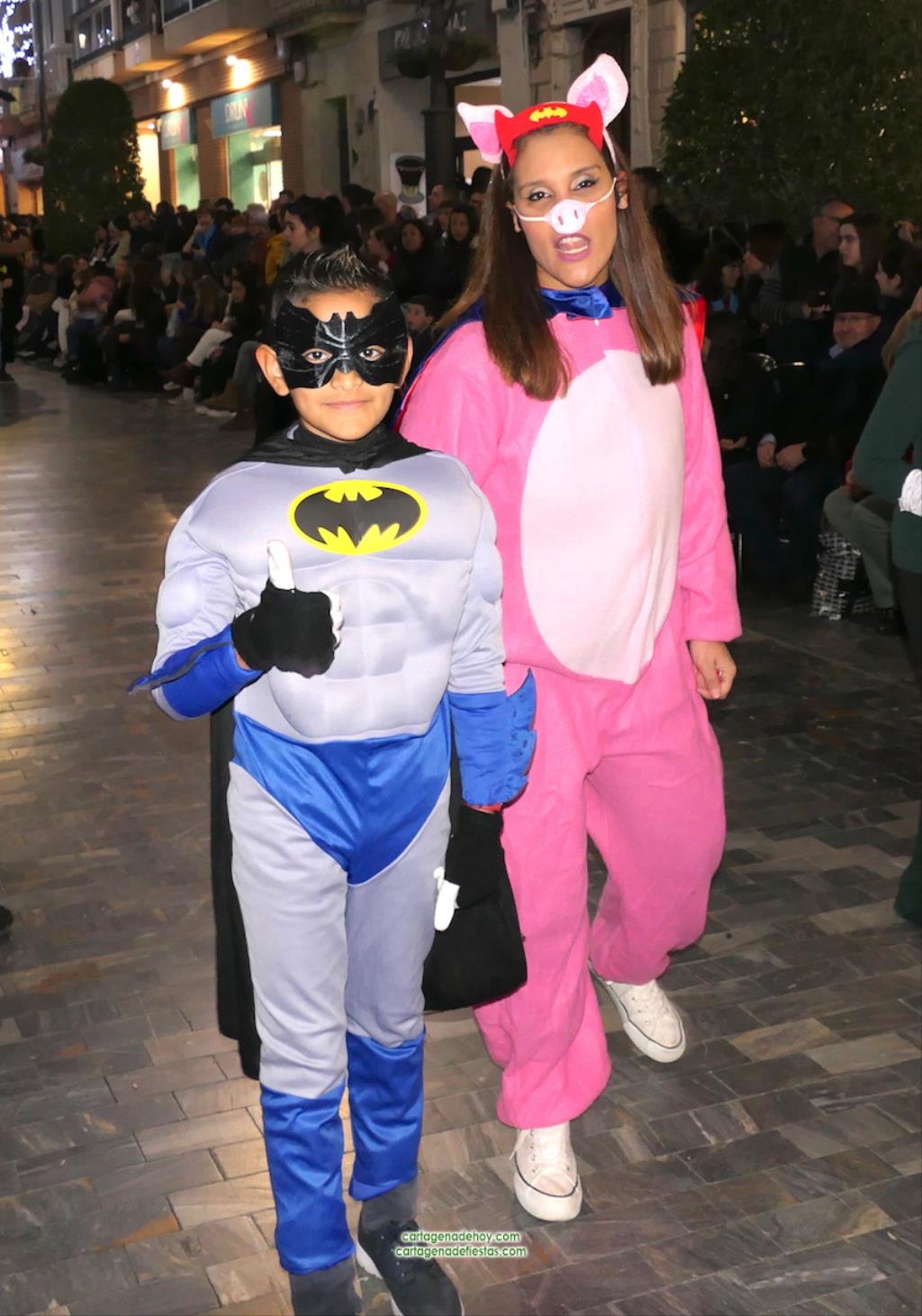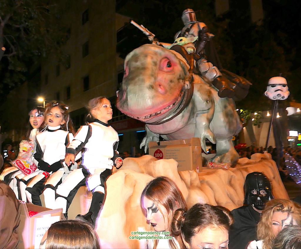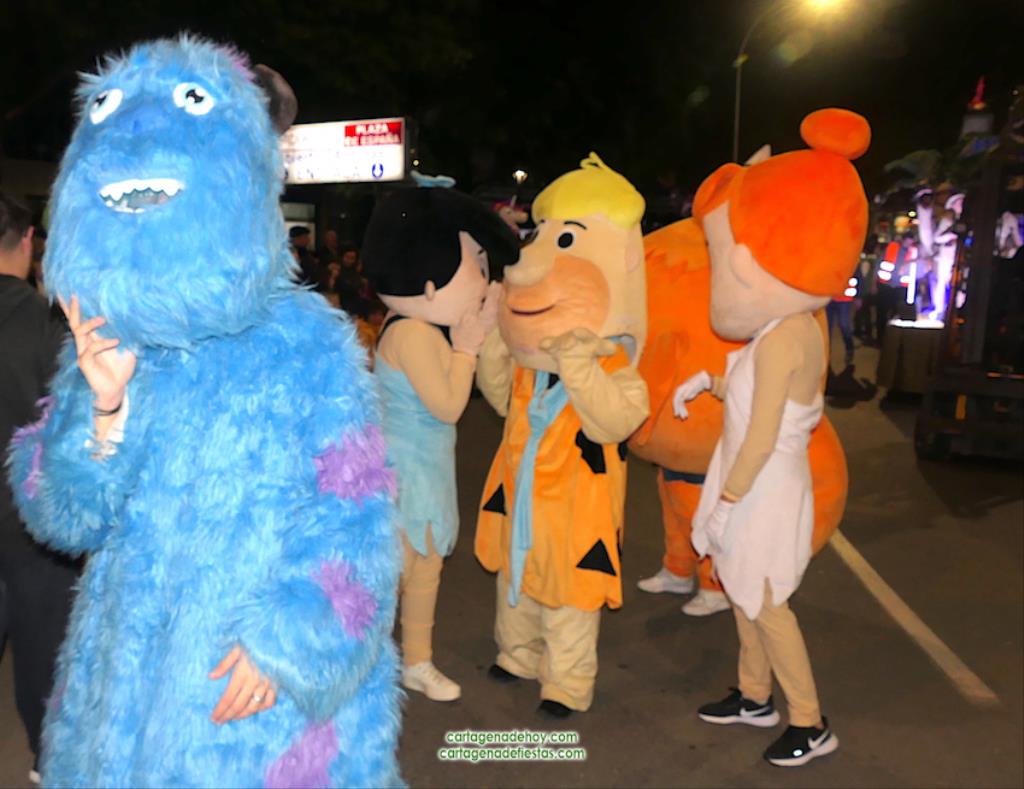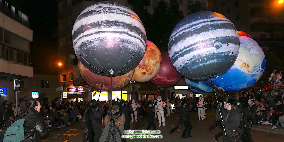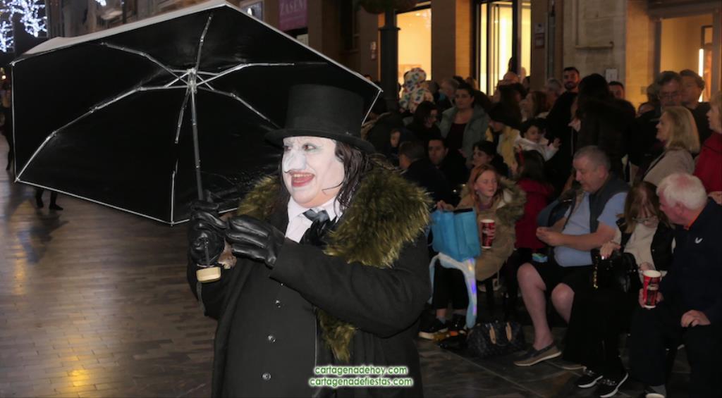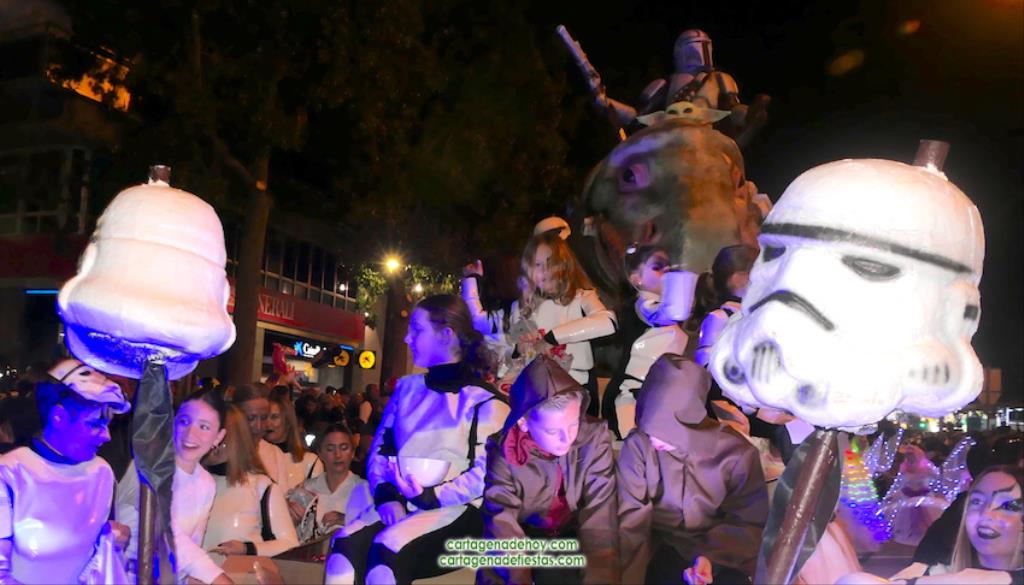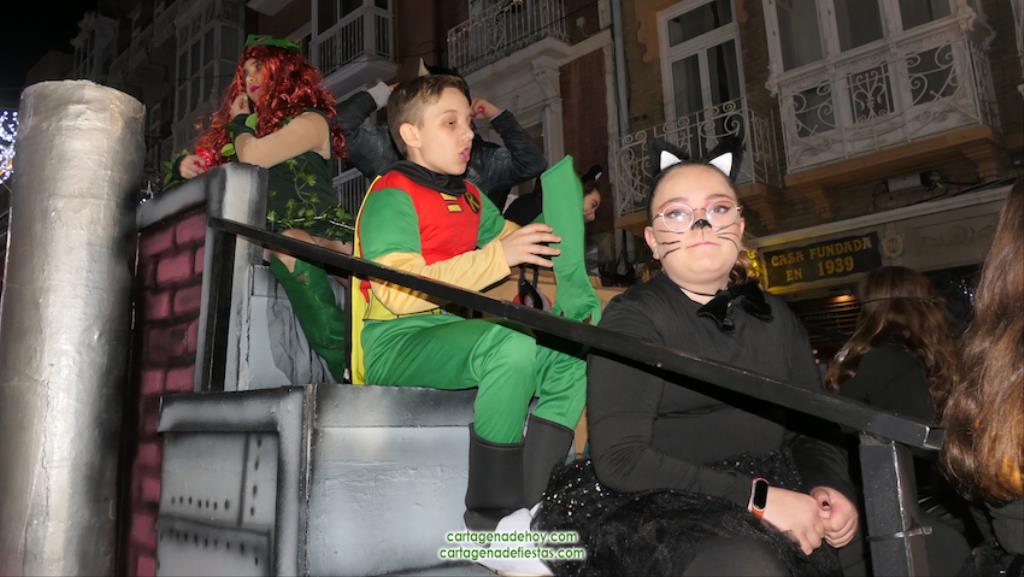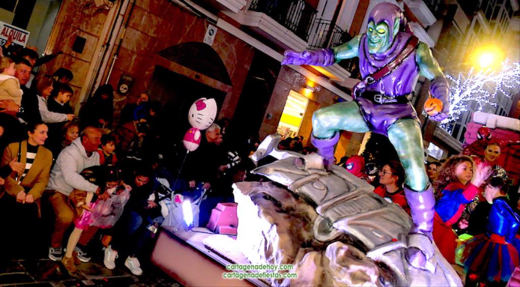 La temática estaba claramente centrada en películas de gran popularidad del cine, comenzando por ‘los mundos de Batman y de Spiderman’ en cabeza con los carnavaleros y siguiendo con ‘La guerra de las galaxias’, los personajes creados por Walt Disney y otros de diferentes procedencias, como Tadeo Jones, Jurasic Park, Mario Bros, Dragon Ball, Toy Story, etc. Entre cada carroza, grupos animadores con diferentes vestuarios, destacando los gigantescos cisnes por su interacción con el público. Otro detalle: nos dio la sensación que esta vez había más ‘malotes’ (El pingüino, El duende verde, Jóker…) que héroes y heroínas. Ser malo está de moda.