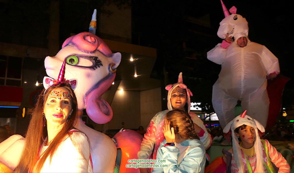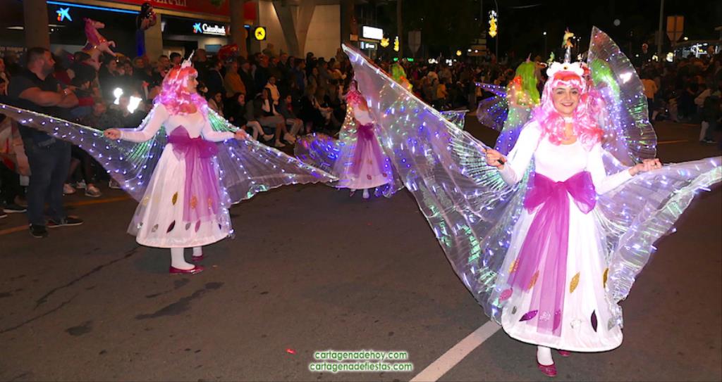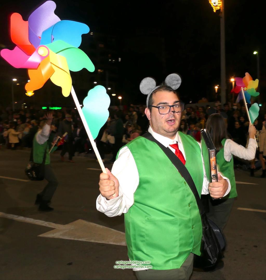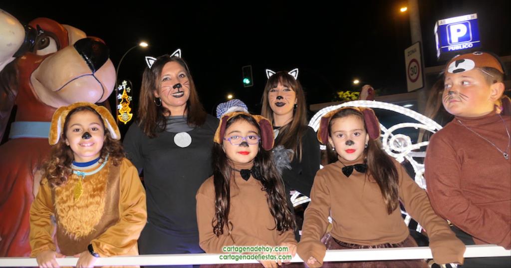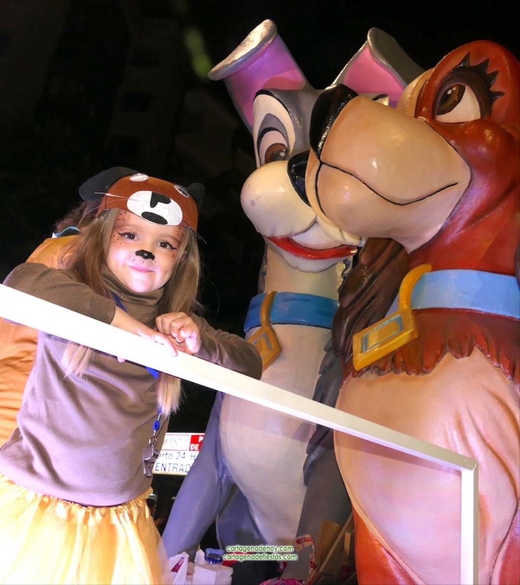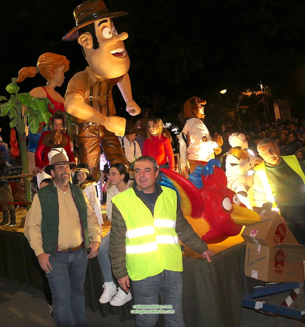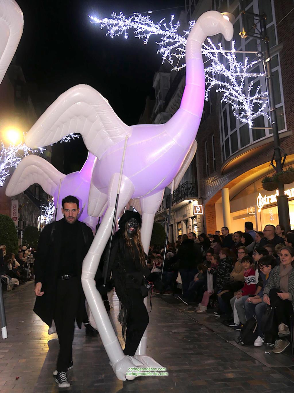 La temática estaba claramente centrada en películas de gran popularidad del cine, comenzando por ‘los mundos de Batman y de Spiderman’ en cabeza con los carnavaleros y siguiendo con ‘La guerra de las galaxias’, los personajes creados por Walt Disney y otros de diferentes procedencias, como Tadeo Jones, Jurasic Park, Mario Bros, Dragon Ball, Toy Story, etc. Entre cada carroza, grupos animadores con diferentes vestuarios, destacando los gigantescos cisnes por su interacción con el público. Otro detalle: nos dio la sensación que esta vez había más ‘malotes’ (El pingüino, El duende verde, Jóker…) que héroes y heroínas. Ser malo está de moda.
