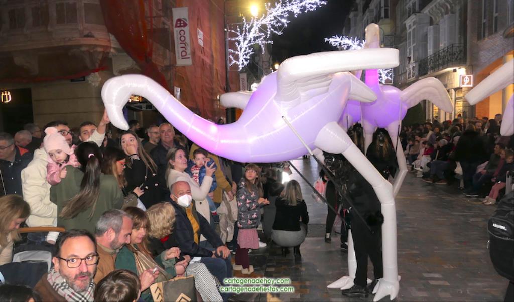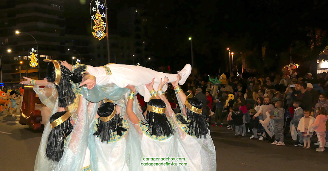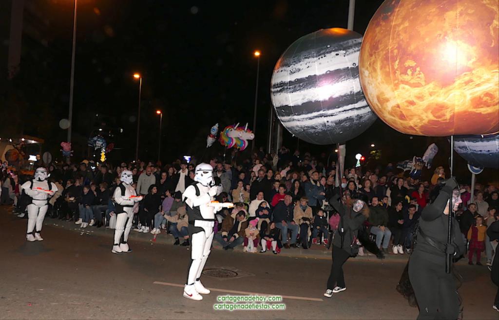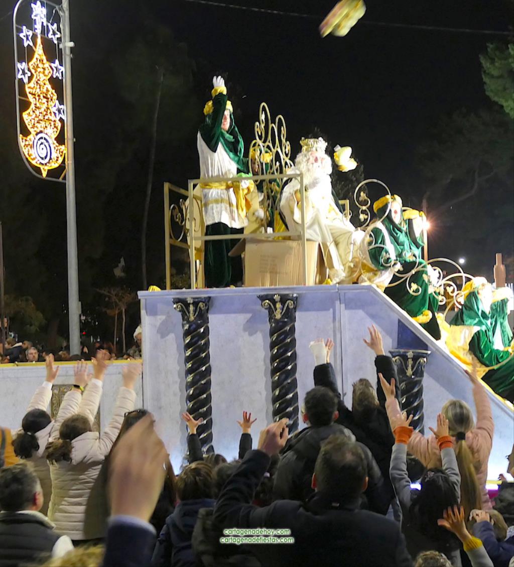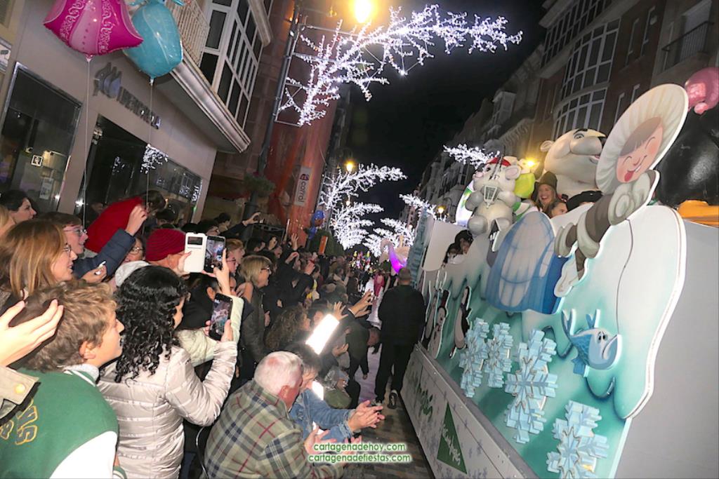 Los Reyes Magos aún forman la sociedad limitada (no admite más socios) más popular de la Navidad española pese a la irrupción del ‘yanqui Papá Noel’. Fue en 1866 cuando en Alcoy se celebró la primera cabalgata de Reyes Magos en nuestro país. Desde entonces, y salvo causas de fuerza mayor (Guerra Civil, pandemias…), es una de las grandes citas de la chavalería de muchos lugares, entre los que, como es obvio, figura Cartagena, donde la presencia de los ‘magos’ se multiplica por las poblaciones de su amplio territorio municipal, siendo el epicentro la gran cabalgata de la ciudad, que anoche regresó con todo esplendor tras el vacío de 2021 y las limitaciones de 2022. El público respondió de forma espectacular. ¿Fue el desfile más multitudinario? Es posible, pero si no lo fue, estuvo cerca con una multitud arropando a las carrozas en su recorrido por alameda de San Antón, plaza de España, calle del Carmen, Santa Florentina, Juan Fernández y paseo de Alfonso XIII. Un detalle: otra vez, las terrazas hosteleras del casco histórico a tope. La cifra de visiones se multiplicaría si tenemos en cuenta que fue ofrecida en directo por la televisión autonómica 7RM.