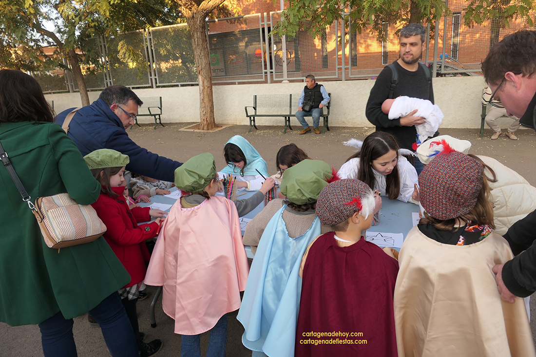 La comitiva de los Magos de Oriente por la Barriada de Hispanoamérica hizo varios altos para llevar a cabo diversos talleres con los pequeños pajes, angelitos y otros personajes belenistas que acompañaron a sus majestades.