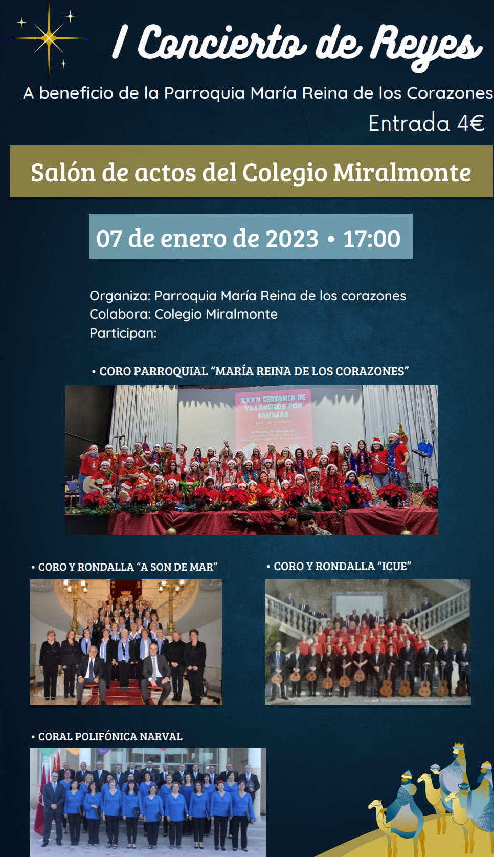 El salón de actos del colegio Miralmonte acoge hoy, a partir de las 17 horas, las actuaciones del coro parroquial ‘María Reina de los Corazones’, coro y rondalla ‘A son de mar’, coro y rondalla ‘Icue’ y coral polifónica ‘Narval’. El dinero recaudado se destinará a la parroquia, que tiene en marcha el proyecto de una nueva iglesia.