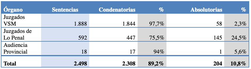 El número total de sentencias dictadas en 2024 fue de 2.498 y, de ellas, 2.308 fueron condenatorias y 204 (el 10,8 %), absolutorias.