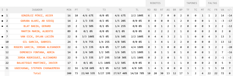 Parciales de cada cuarto: 13-16, 15-36 (marcador de 28-52), 19-16 (47-68) y 26-15 (73-83).