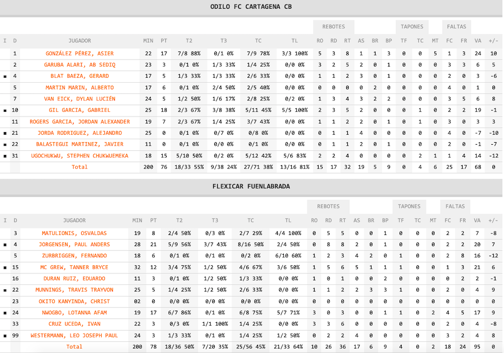 De la estadística global, destacar que se refleja cierta igualdad en el rebote (32 de los locales por 36 de los visitantes), pero que lo cierto es que fue por rachas. Respecto a los tiros, Fuenlabrada se quedó enun 64% el acierto en tiros librs (21/33) por un 81% el cuadro de Juste (13/16). Similar fueron los tiros de dos puntos (18/33 el Odilo por 18/36 el Fuenlabrada). Llamada la atención que los locales probaron el tiro triple más veces (38) que el doble (33). Sólo anotaron 9 veces (24% de acierto, es decir, que tenían que lanzar 4 veces para anotar una), con lo que ese apartado numérico fue mejor el rival (7/20). Como dijimos antes, son muchos los factores que influyen en el juego, pero en este caso creo que hubo más 'me culpa' que mérito del rival, dejando claro que no quiero decir que no luchase por ganar el Fuenlabrada, pero sí que lo vi en el cuarto final 'entre las cuerdas' y en esos casos influye más el que domina que el dominado.