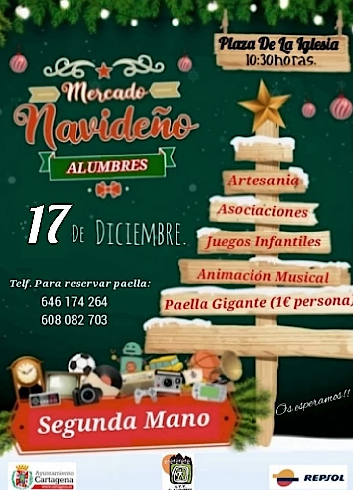 Organizado por la asociación de vecinos, con la colaboración del Ayuntamiento de Cartagena y de Repsol, tendrá lugar el domingo 17 de diciembre con productos de segunda mano y artesanía, además de presencia de las asociaciones alumbreñas, juegos infantiles, animación musical y una arroz gigante.