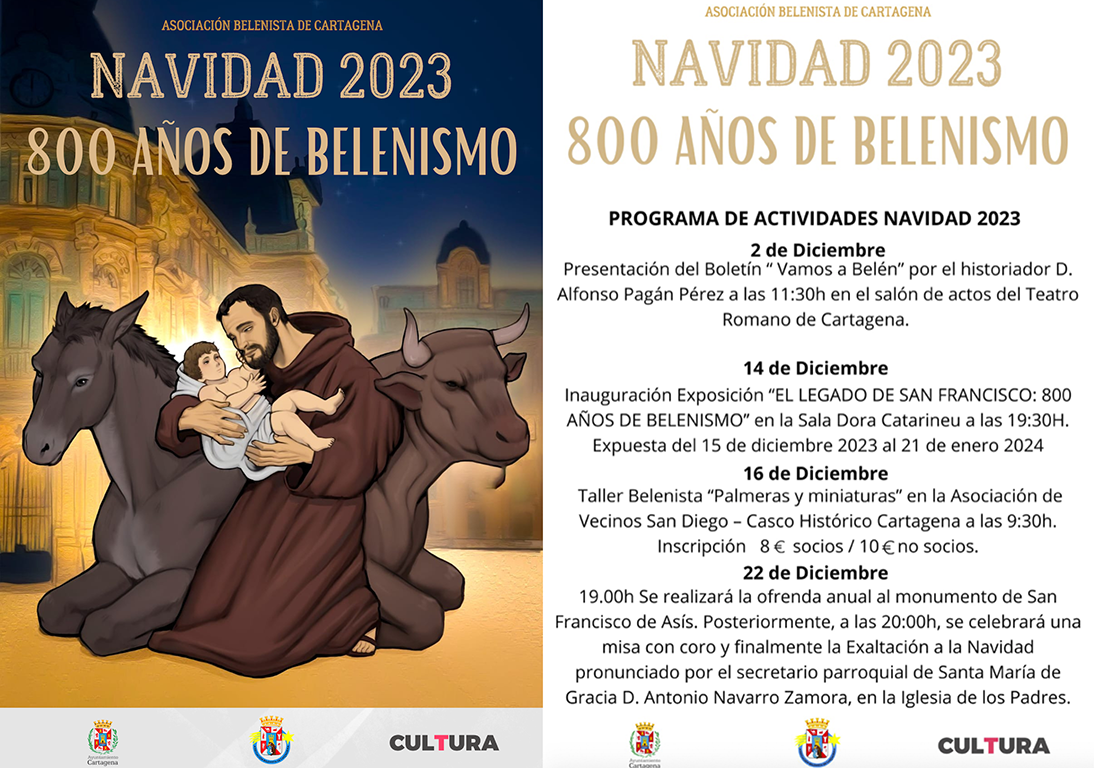 El primer acto será la presentación del boletín 'Vamos a Belén' a cargo del historiador Alfonso Pagán en el Teatro Romano. Después, el día 14, se inauguará la exposición 'El legado de San Francisco' e la sala Dora Catarineu y dos días más tarde se llevará a cabo un taller de palmeras y miniaturas en el local social de San Diego. El 22 culminará el programa con diversos actos.