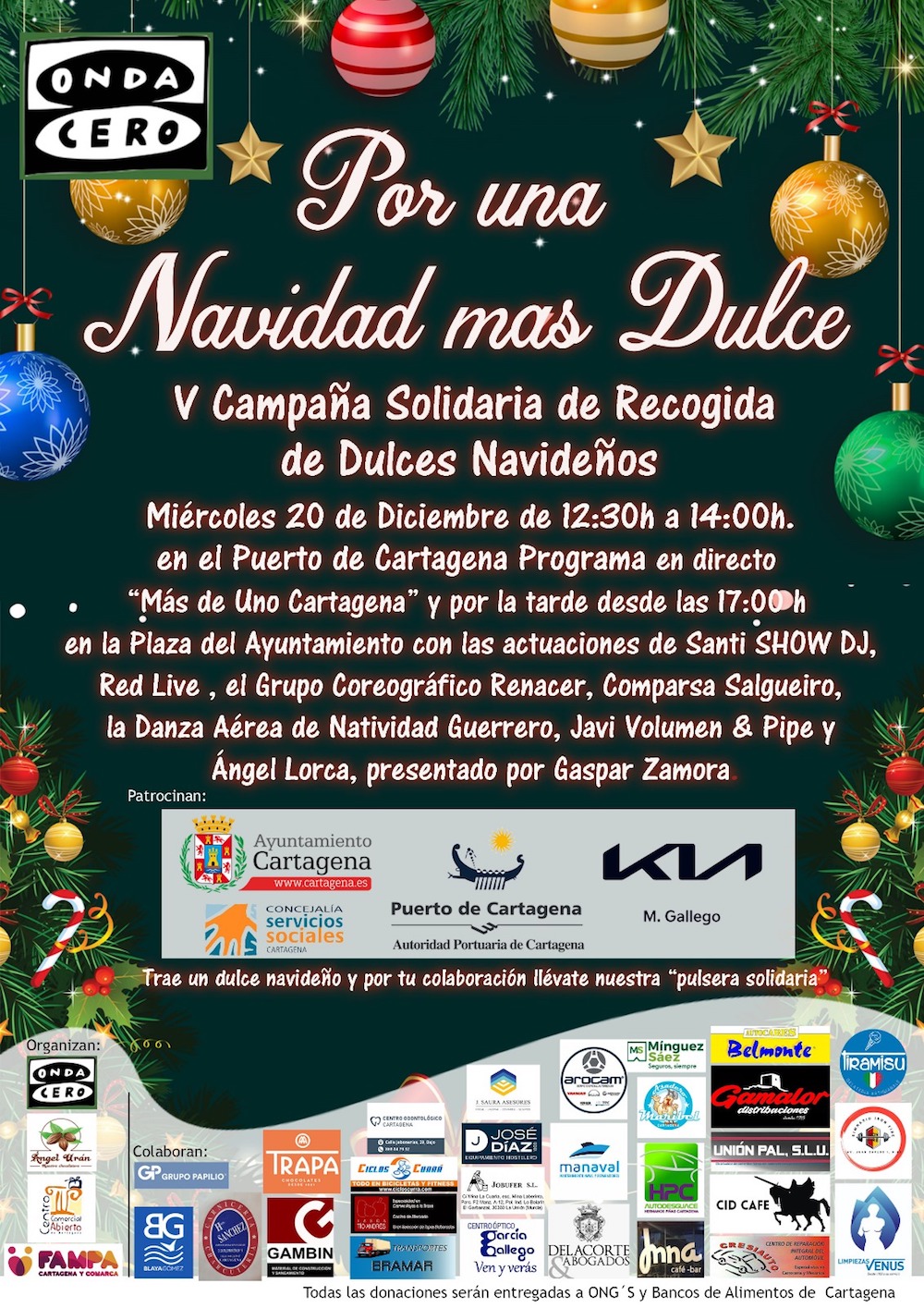Los compañeros de la emisora de Onda Cero Cartagena vuelven a poner en marchar la campaña solidaria de recogidas de dulces navideños en su quinta edición, que irá destinada a distintas ONGs de la ciudad y al Banco de Alimentos de la Región de Murcia de Cartagena. Se puede contribuir con esta iniciativa el miércoles 20 por la mañana durante la emisión local y por la tarde, desde las 17 oras, durante un espectáculo en la plaza del Ayuntamiento con distintas actuaciones.