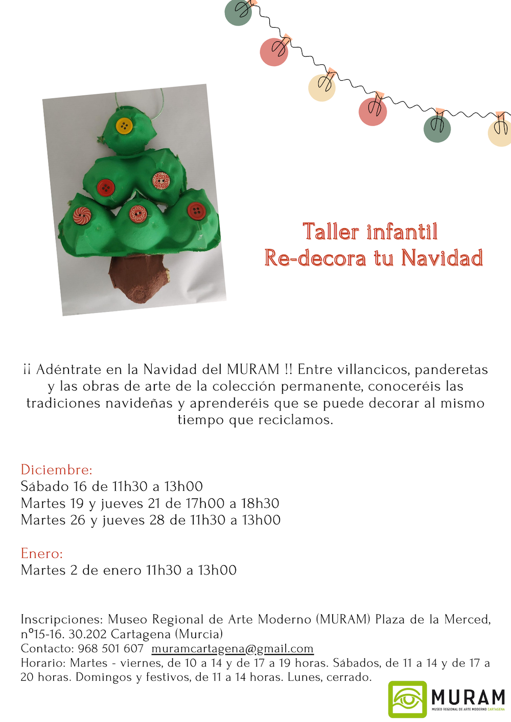 El Museo Regional de Arte Moderno, ubicado en la plaza de la Merced ('El Lago'), llevará a cabo la actividad 'Re-decora tu Navidad' durante cinco días de diciembre y uno de enero dirigido a los chavales, que disfrutarán entre villancicos, panderetas y obras de arte mientras conocen las tradiciones navideñas.