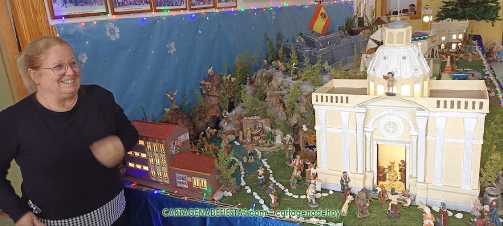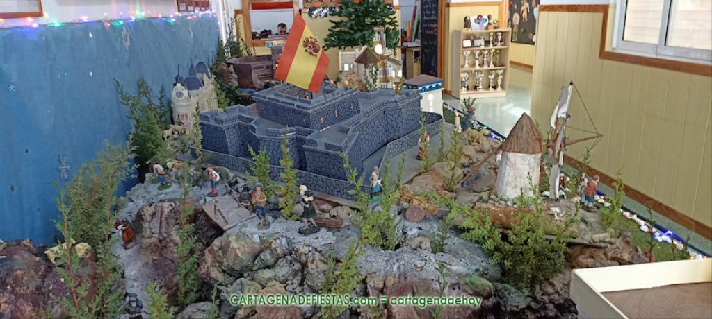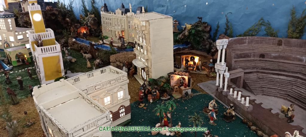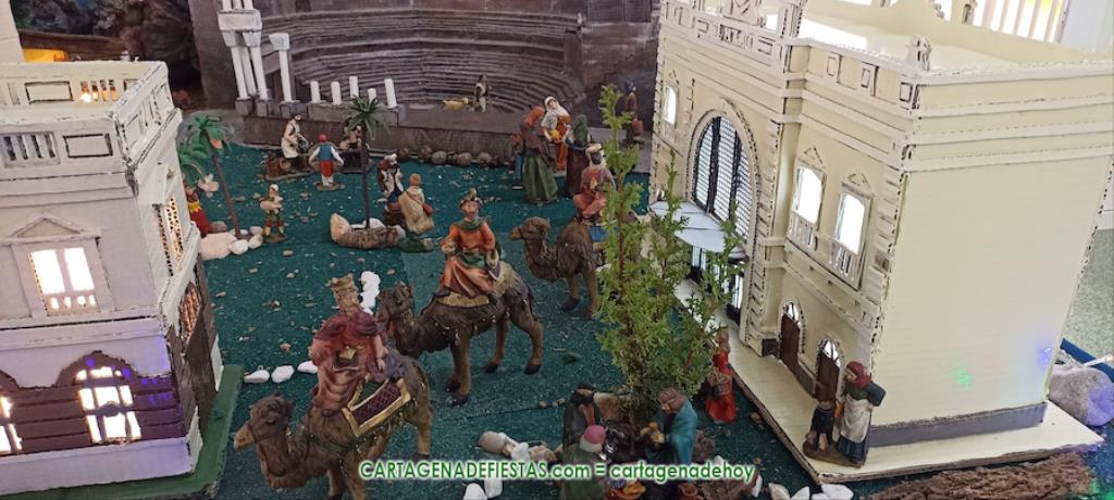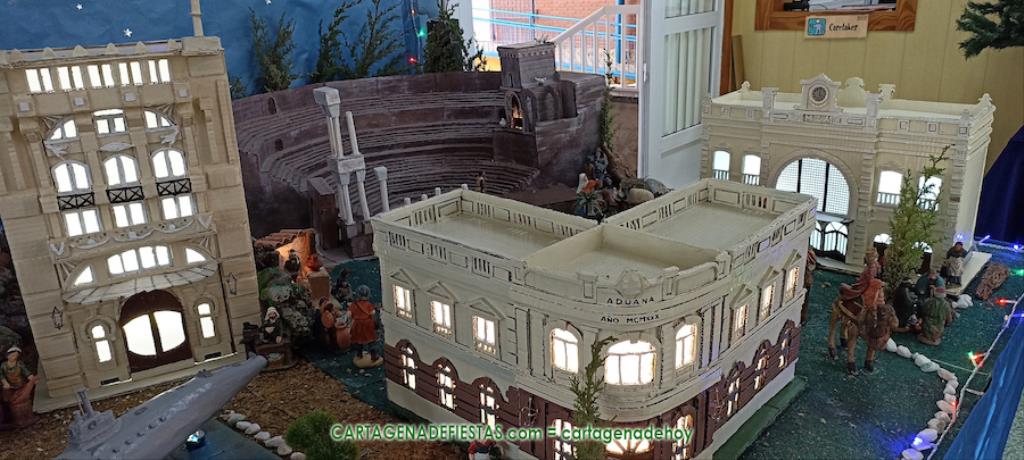 Primero fue el Arsenal y luego llegaron conocidas edificaciones del pueblo: La Barraca, el local de la asociación vecinal, la iglesia y, por supuesto, el colegio. La lista se fue ampliando con el Teatro Romano, la Catedral de Santa María, el arma submarina de Isaac Peral, el castillo de la Atalaya, el faro de Navidad, el Gran Hotel y varios más, incluida la pescadería de Santa Lucía, con una lonja en la que no faltan los precios de los productos en dinarios. Aquí cabe apuntar que en el capítulo de las figuras se ha apostado por los oficios, además de dejar plasmado el relato que comienza con la anunciación, el edicto del César para que los residentes se apunten en el censo y los vecinos acudiendo a hacerlo, en este caso, al Palacio Consistorial. Volviendo a los edificios, la novedad de este año es la estación de Renfe.