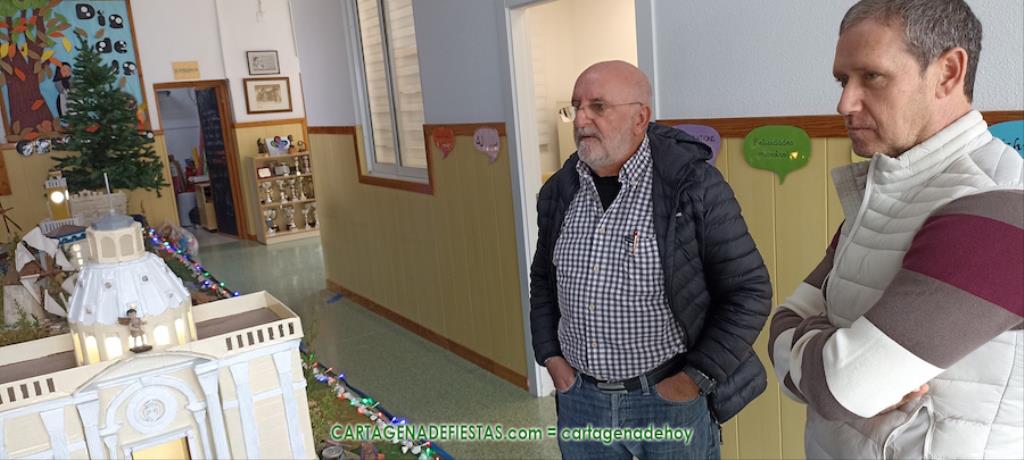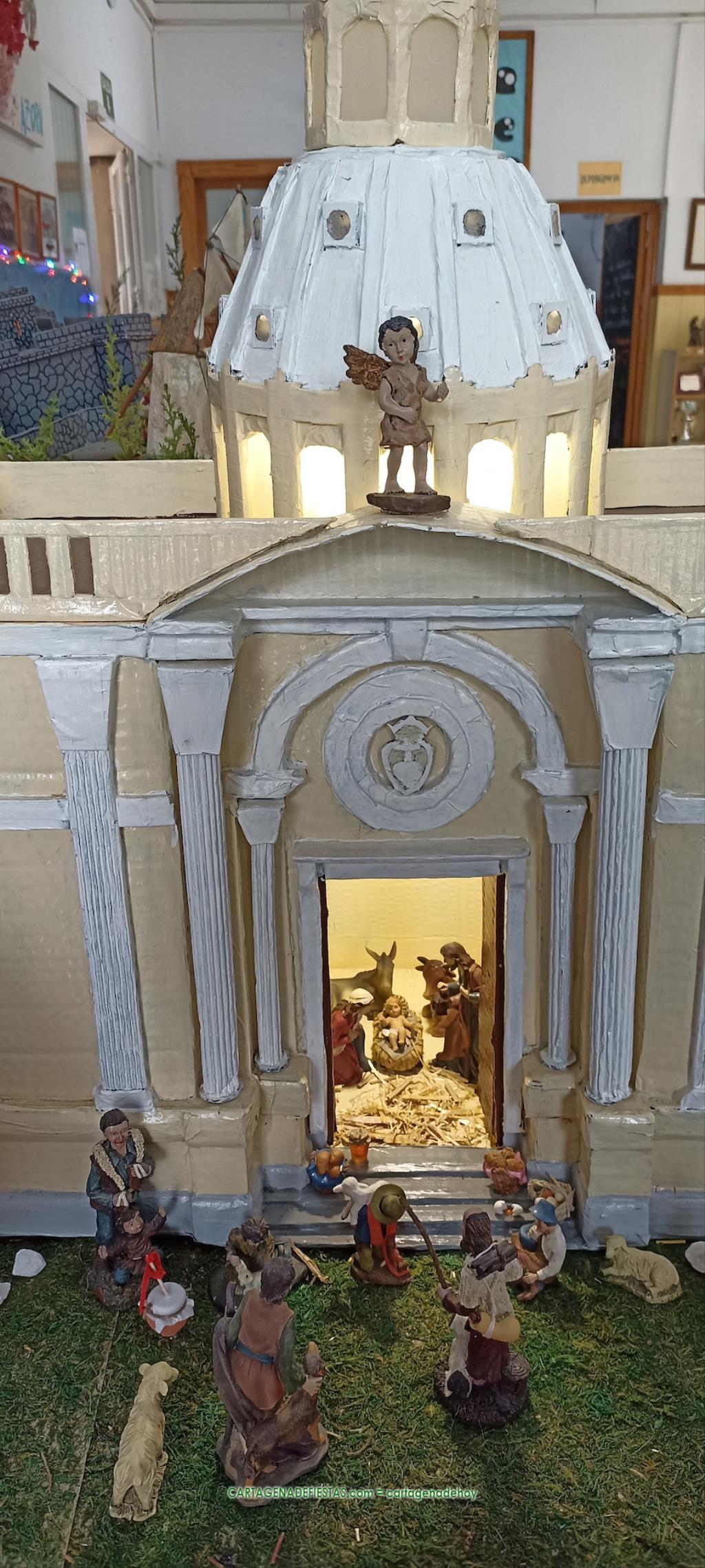 Desde entonces, cada año ha ido introduciendo un edificio emblemático del casco histórico de Cartagena. "El Belén tiene ahora el espíritu de Salzillo, que creó el suyo con elementos tradicionales murcianos", expresa el director, Francisco Alcaraz Díaz, quien nos acompaña en la visita que efectuamos al centro docente de Molinos Marfagones junto a Encarnación Pérez Cano, maestra de Religión e impulsora de esta iniciativa junto a su esposo, José Vicente García, el 'manitas' de la construcción artesanal con elementos reciclados, pues todo lo que lleva este montaje está creado a partir de cartones, latas y, entre otros, de motores de microondas o de lavadora, como el sistema del circuito del largo río. "Es de lo más complicado asegurar su curso, pues hasta que no está asegurado que no sufre pérdidas no podemos comenzar el resto del montaje", apunta Encarnación Pérez.