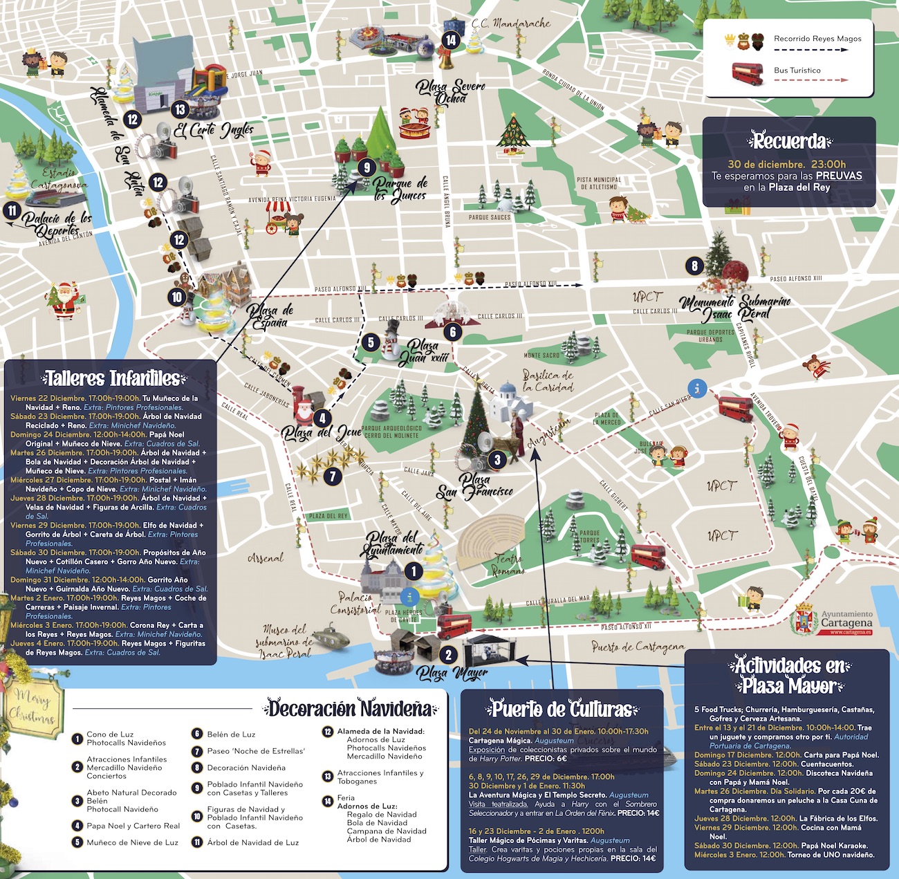 El Ayuntamiento de Cartagena y El Corte Inglés han publicado un mapa de la ciudad que muestra los puntos principales de la ciuidad para disfrutar de la Navidad. También muestra el itinerario más atractivo para contemplar la decoración navideña de las luces, incluyendo los photocalls, el muñeco de nieve de la plaza Juan XXIII o las atracciones infantiles instaladas junto a El Corte Inglés. Igualmente, enseña el recorrido que seguirá la gran Cabalgata de Reyes.