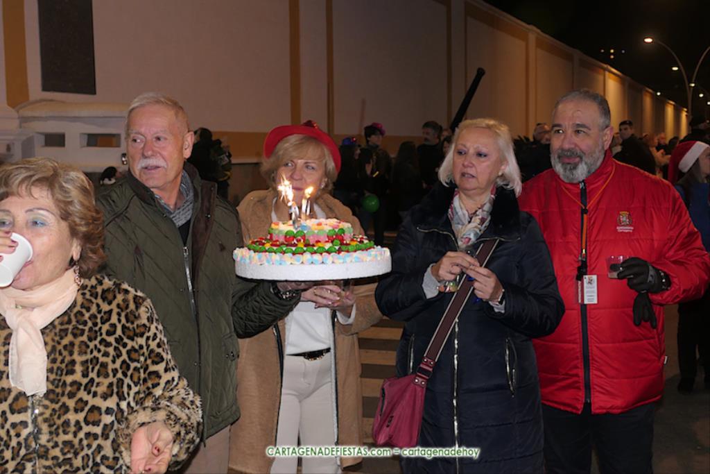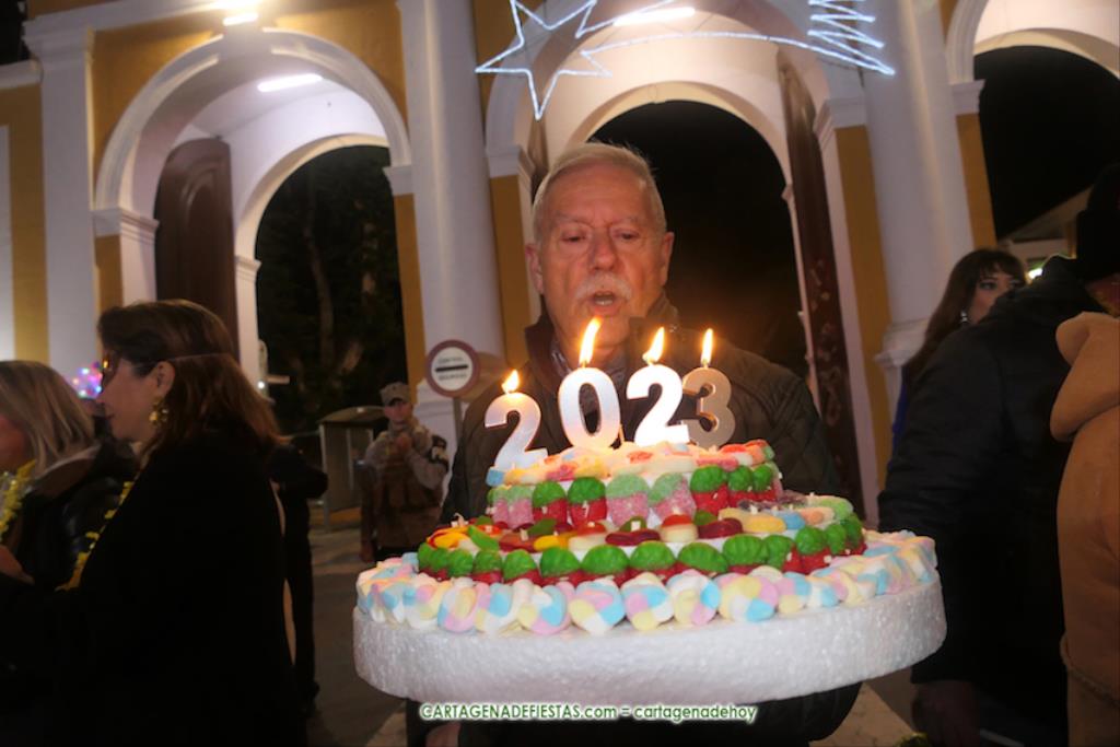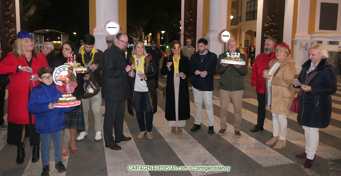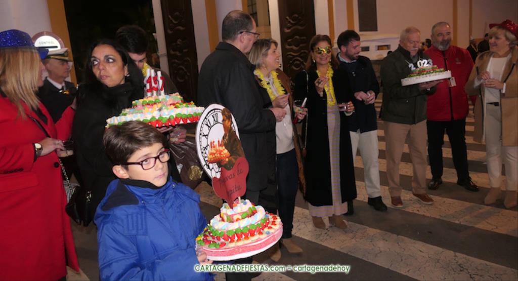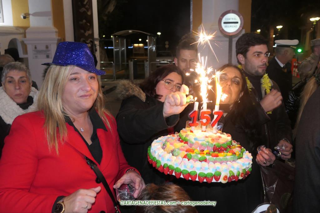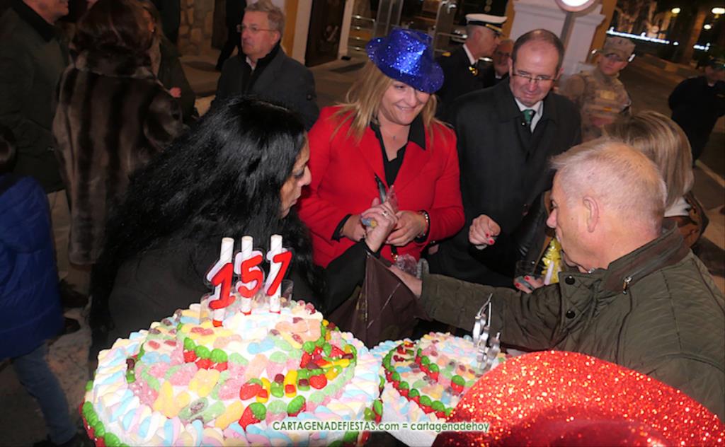 Después llegó el momento estelar con las 12 campanadas y la toma de uvas, en unos casos, y de golosinas (el equipo de gobierno) en otros, según lo que hubiera llevado cada uno, pues lo que repartió el Ayuntamiento de Cartagena fueron las bolsas de cotillón. Tres tartas lucieron con velas que fueron sopladas a continuación. Una llevaba como distintivo el año 2023, otra plasmaba con un 157 los años de historia del reloj y en la tercera destacaba la foto de Pepita Muñoz, quien encendió una chispa que cada vez hace felices a más cartageneros… y visitantes.