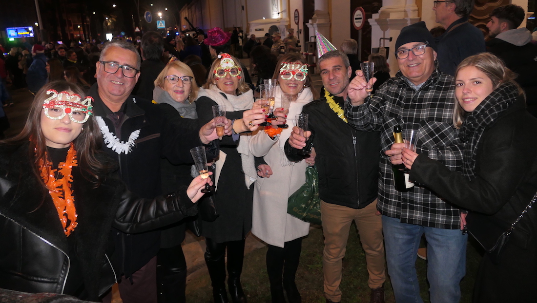 Ahora vamos al desarrollo de la fiesta en sí. Esta vez el protagonismo en la plaza era para los ’40 Principales’ de la cadena Ser, con música de dj desde un escenario que cambió su orientación respecto a 2022 y que era también ‘cañon de chorros de fuego’. La presentadora fue Nazaret Navarro, quien también fue la encargada de presentar los actos centrales ante la fachada del Arsenal, y de entrevistar en directo a a alcaldesa, Noelia Arroyo, y a Antonio Cegarra, presidente de la legalizada ‘Asociación Uvas de Pepita’, que fue uno de los impulsores de estas preuvas junto a la recordada Josefa Muñoz. Ellos pusieron en marcha esta celebración en 2015. Ahora ha cumplido 7 ediciones (hubo un paréntesis por la pandemia). En su inicio estaban en familia y ahora acude una multitud cada vez mayor. Por cierto, lo que sí notamos anoche es una amplia diversidad de colores en las cabezas por los sombreros y otros adornos.