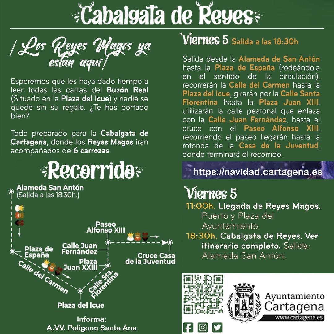 Según nos han comunicado, el viernes 5 de enero desembarcará los Magos de Oriente en el muelle de Cartagena, para después dirigirse a la plaza del Ayuntamiento, donde serán recibidos por las autoridades. Por la tarde, a las 18.30 horas, gran cabalgata por Alameda de San Antón, Plaza de España, calles del Carmen y Santa Florentina, Plaza Juan XXIII y Paseo de Alfonso XIII hasta la Asamblea Regional.