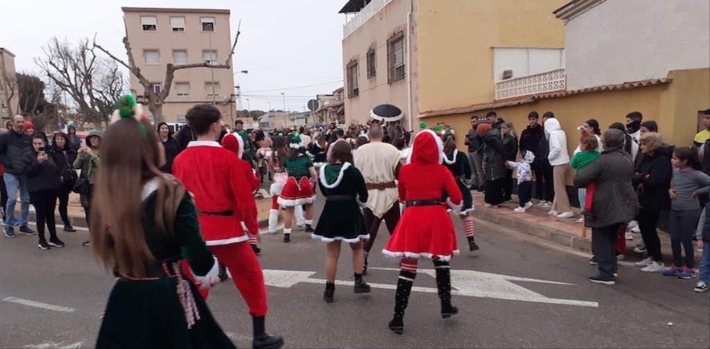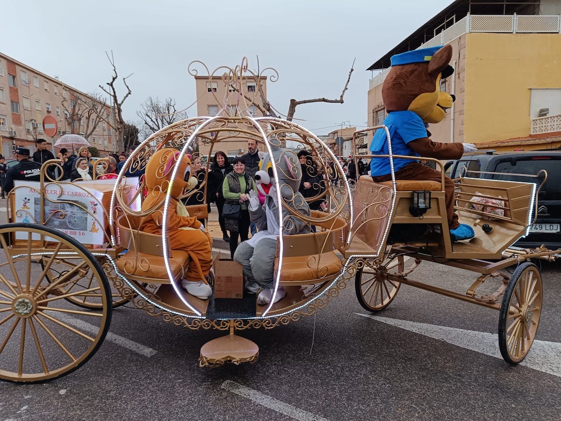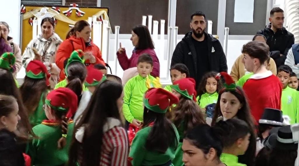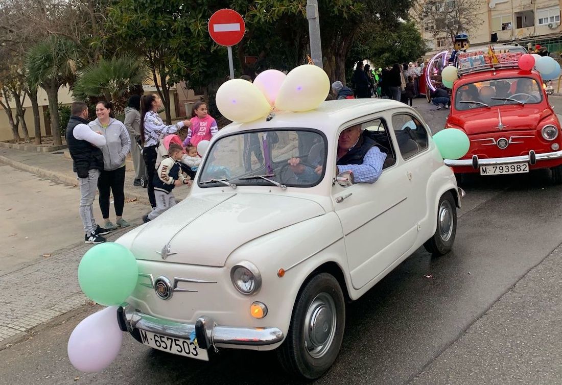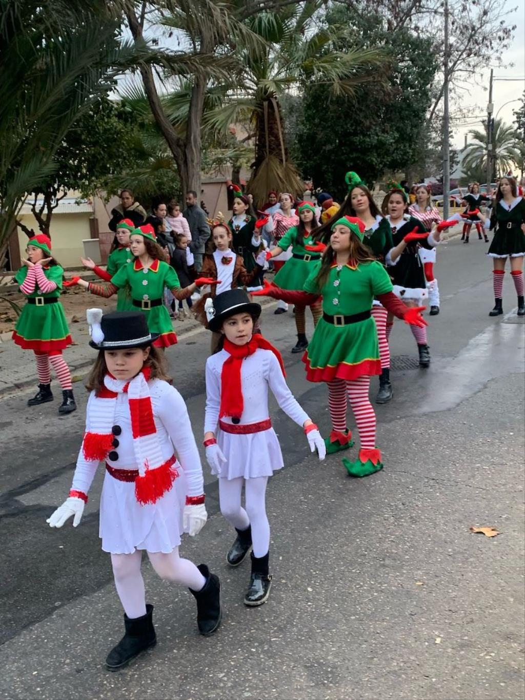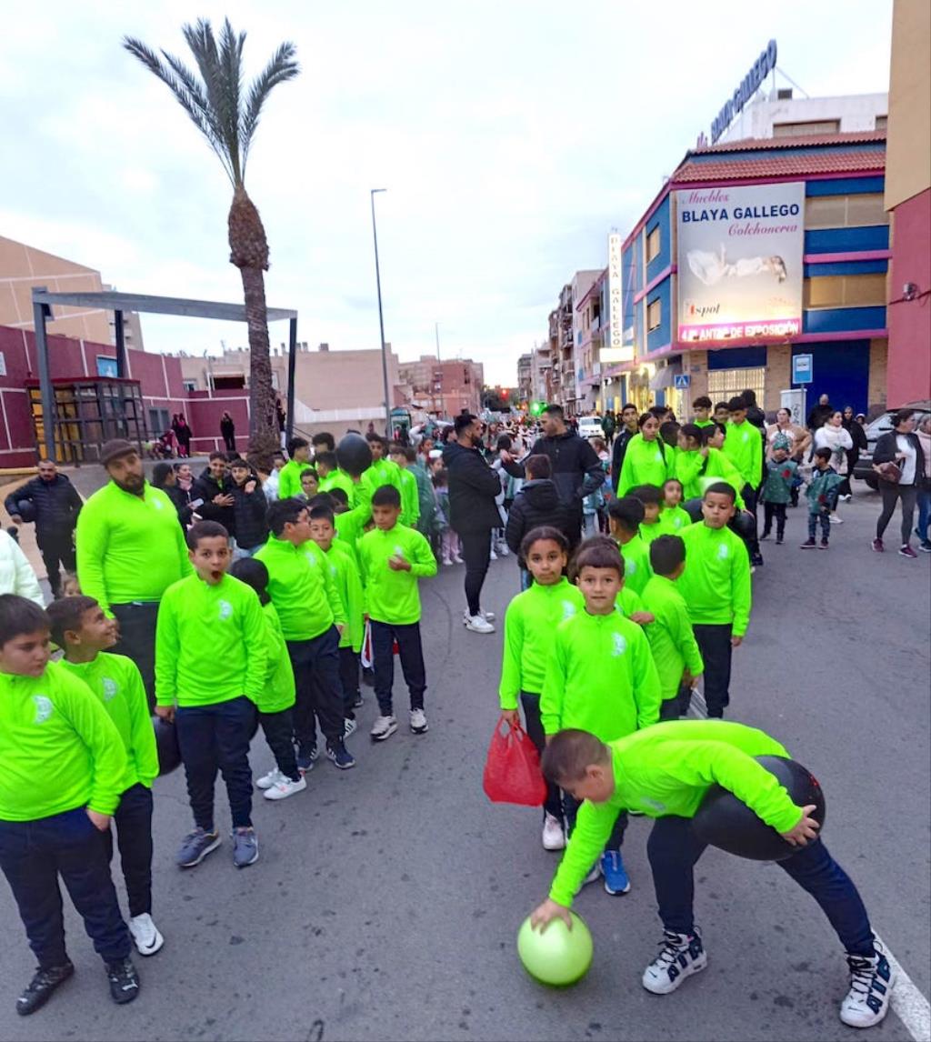 Los Magos de Oriente fueron caminando hasta el lugar de destino, el local social, mientras que los futboleros animaban con los globos del color verde identificativo del club, mientras que los escolares lo hacían con disfraces artesanales, a lo que se sumaban los Seat 600 engalanados para la ocasión, la carroza con personajes Disney y el siempre animoso y contagioso grupo coreográfico ‘Renacer’.