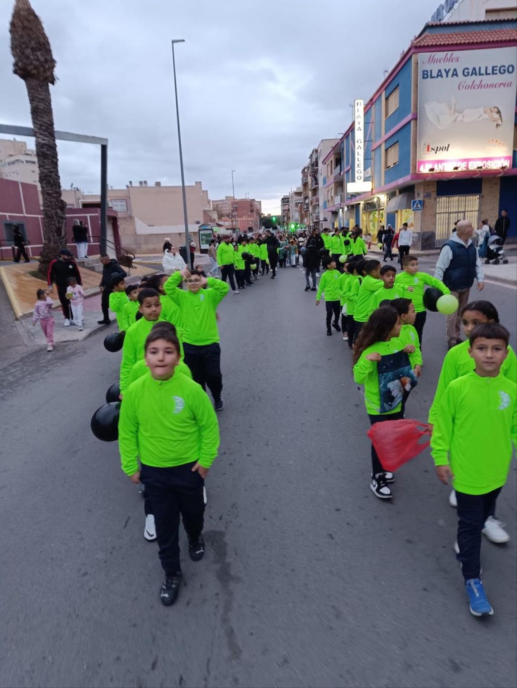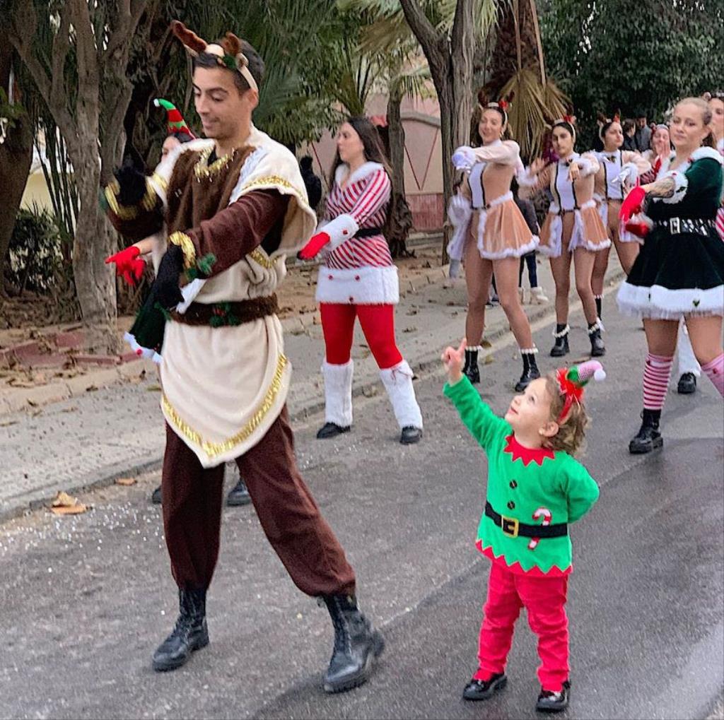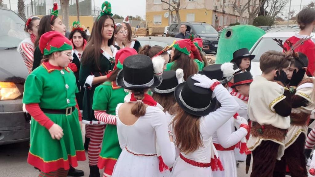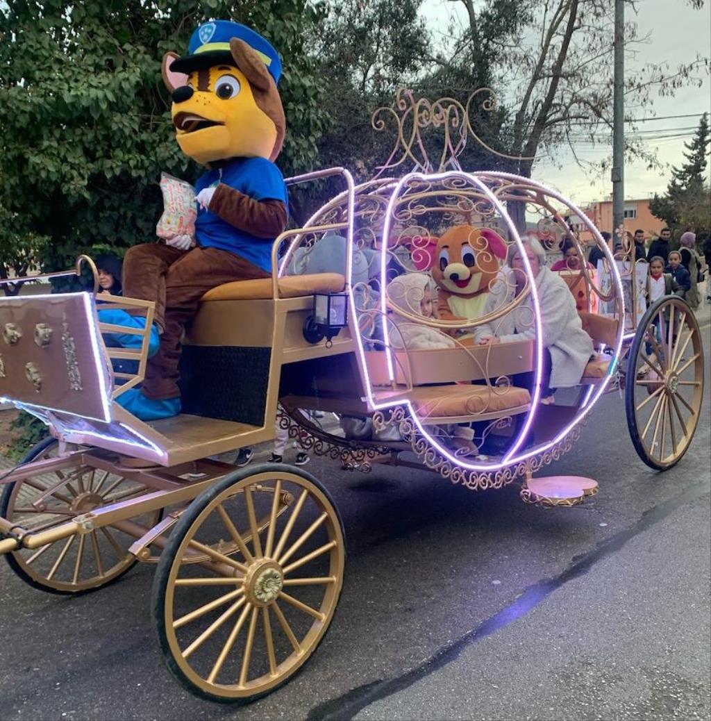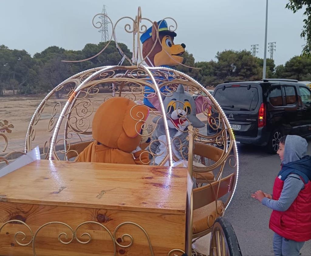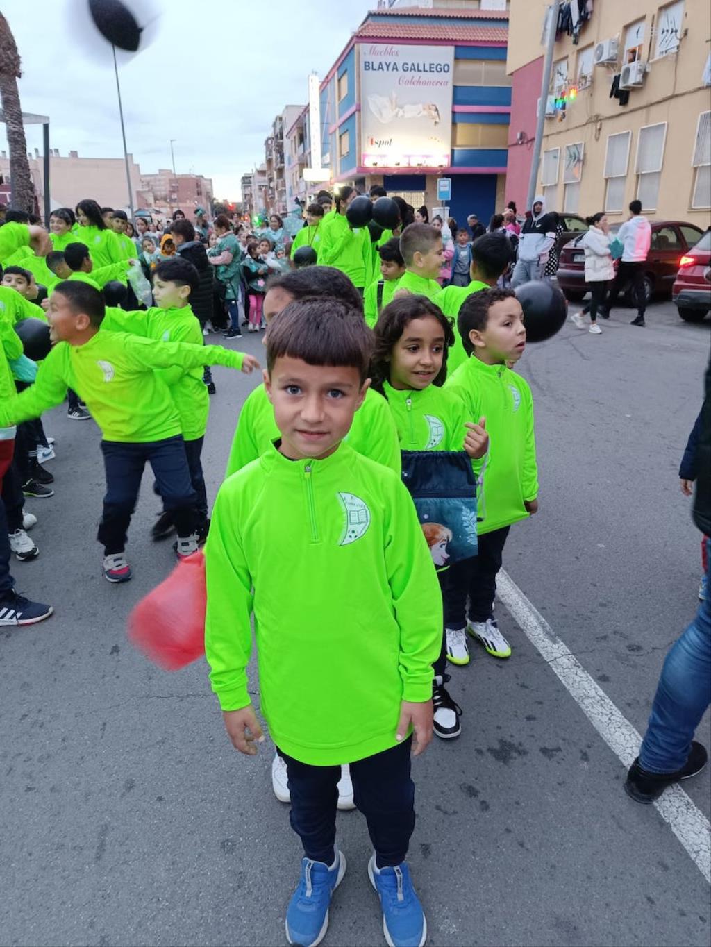Los Magos de Oriente fueron caminando hasta el lugar de destino, el local social, mientras que los futboleros animaban con los globos del color verde identificativo del club, mientras que los escolares lo hacían con disfraces artesanales, a lo que se sumaban los Seat 600 engalanados para la ocasión, la carroza con personajes Disney y el siempre animoso y contagioso grupo coreográfico ‘Renacer’.