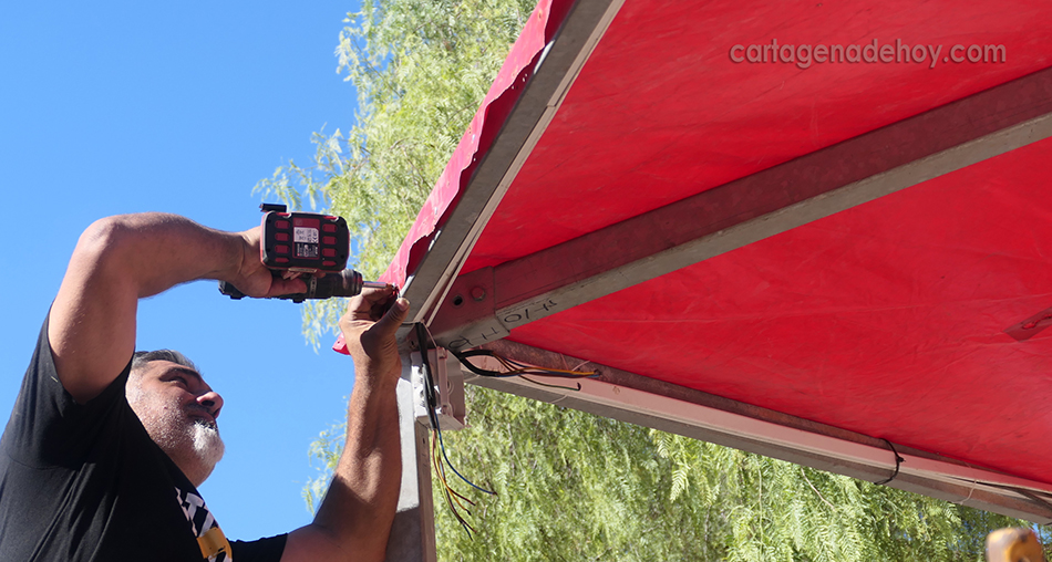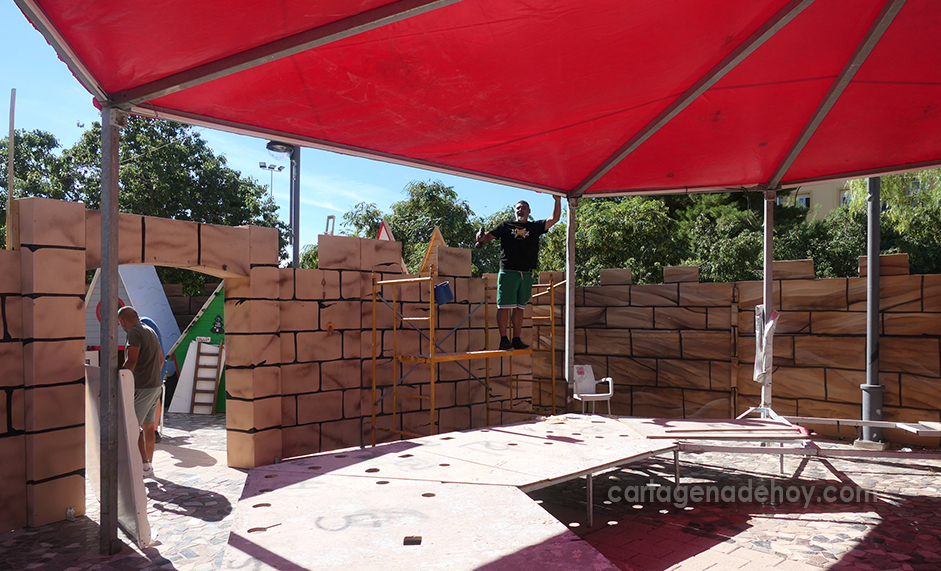 Han comenzado los trabajos para el montaje del tradicional parque de Navidad de la plaza de la Marina Española de Santa Lucía, que acoge el gran belén con figuras en movimiento y diversas casetas y elementos típicos de esas fechas. En la foto, grupo de voluntarios que llevan a cabo las labores.