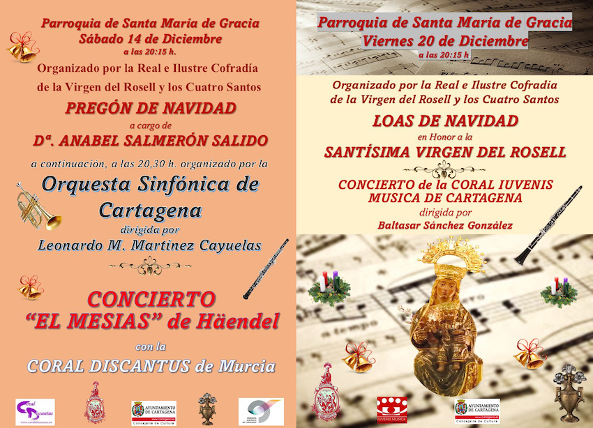 Anabel Salmerón Salido pronunciará este próximo sábado el pregón de Navidad en Santa María, lugar donde después actuarán la Orquesta Sinfónica de Cartagena y la coral 'Discantus' con 'El Mesías' de Häendel, mientras que el viernes 20 las loas en honor a la patrona contrá con la coral Iuvenis Música de Cartagena.