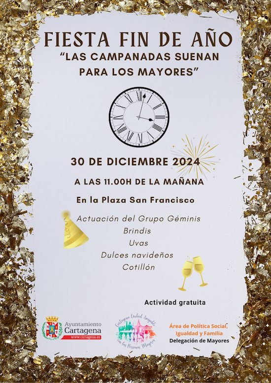 Los mayores de Cartagena despedirán el año con una serie de actividades navideñas, como talleres para realizar adornos, elaboración de dulces típicos o el plan que sin duda será el plato fuerte de esta programación, una fiesta de fin de año que tendrá por título "Las campanadas suenan para los mayores", contará con música animación, por supuesto uvas y cotillón y se celebrará el lunes 30 de diciembre a partir de las 11 horas en la Plaza San Francisco.