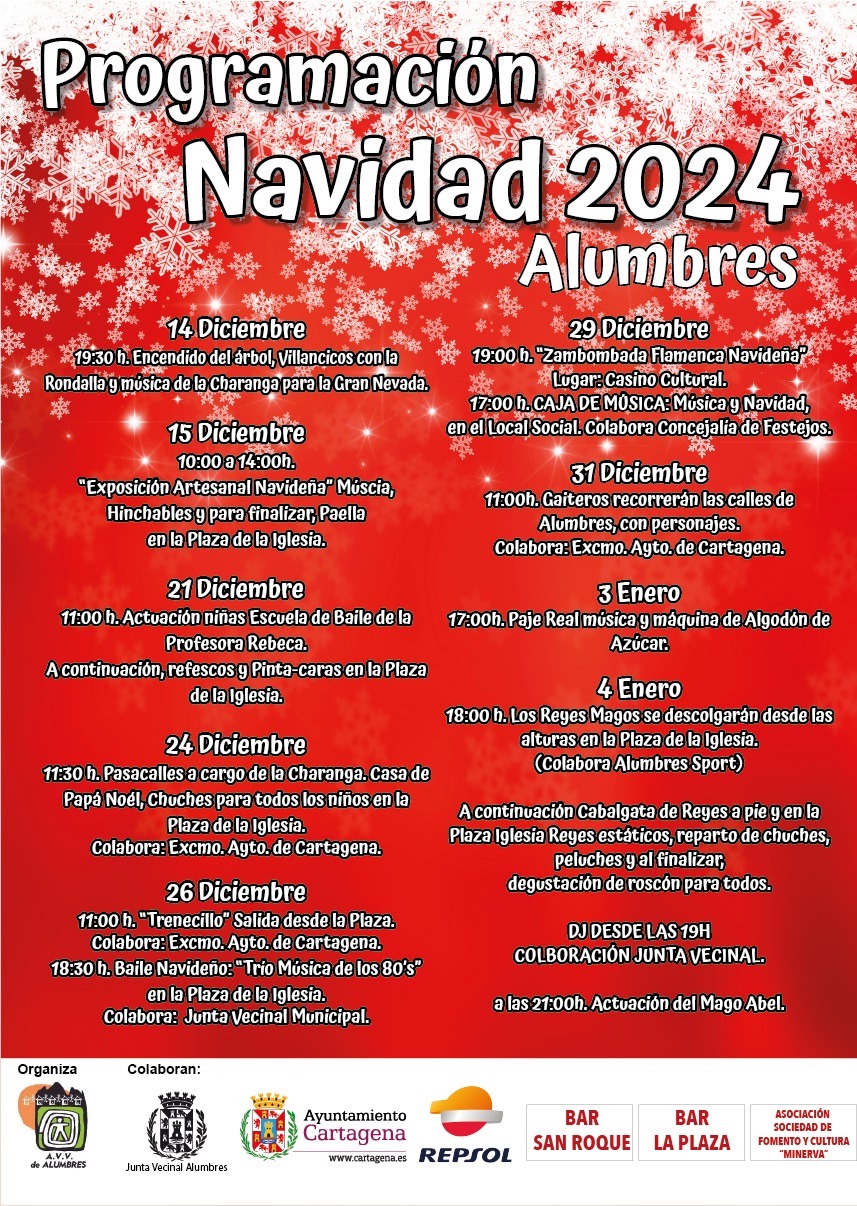 El programa que organiza la asociación de vecinos arrancó anoche con el encendido del árbol bajo 'una gran nevada' y el canto de villancicos con la charanga de la Agrupación Musical 'Cartagena 1990'. Esta mañana hay exposición artesanal con música, hinchables y arroz. El programa, que se extenderá hasta el 4 de enero, incluye una 'Zambombada flamenca' el día 29 en el Casino Cultural.
