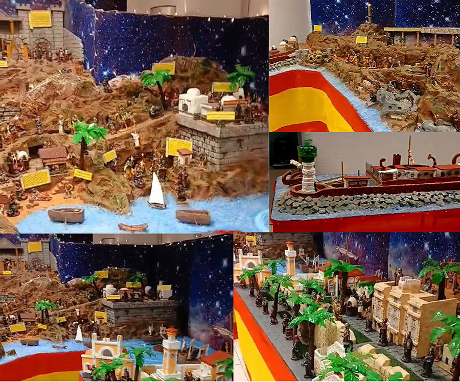 El belén representa lugares emblemáticos de Cartagena como la muralla de Carlos III, la puerta principal del Arsenal, el faro de La Curra, cala Cortina o la chimenea de Peñarroya, entre otros.