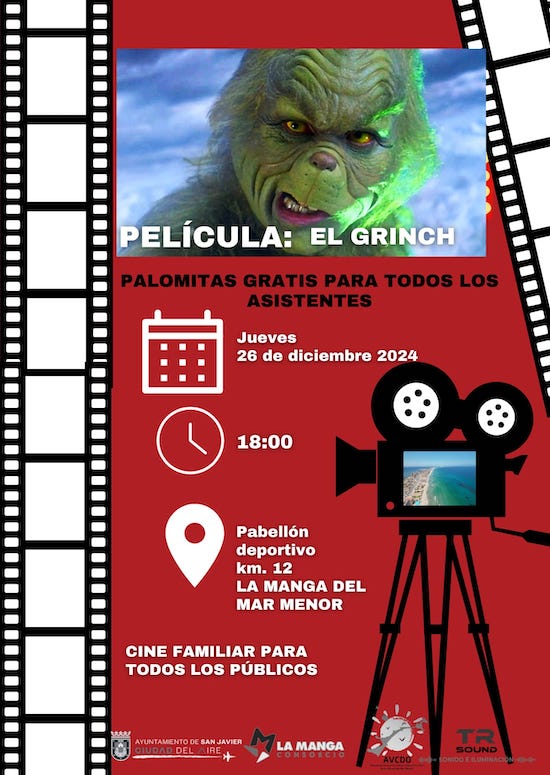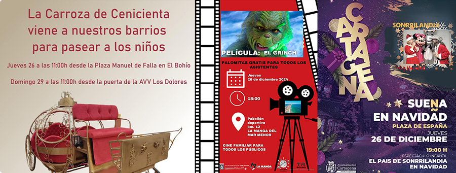 La carroza de cenicienta está esta mañana en los barrios de Cartagena Norte con salidas desde Los Dolores y San Cristóbal. Por la tarde, 'El Grinch' se proyecta en La Manga. En la ciudad, tarde con espectáculo en la plaza de España y villancicos pop en la plaza del Icue, entre otras propuestas.