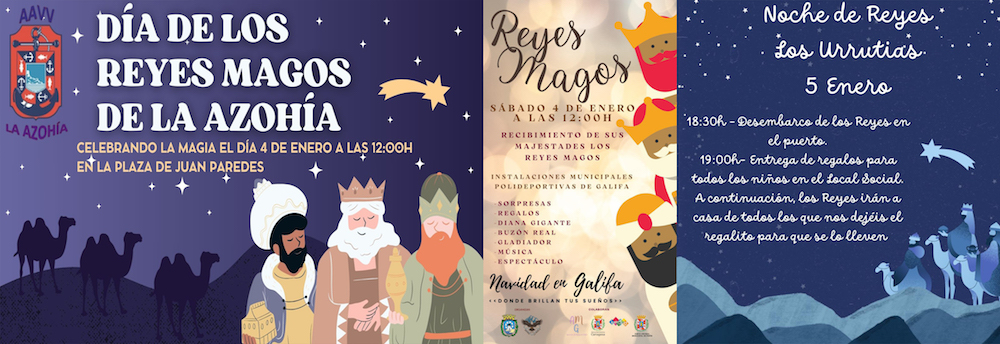 En La Manga llegan Melchor, Gaspar y Baltasar este domingo a las Galerías Flamenco a las 18.20 horas. Habrá roscón, chocolate y regalos. En Cabo de Palos los Magos de Oriente llegan a las 19.30 horas del mismo día en barco y de ahí a la iglesia, done tendrá lugar la adoración al niño Jesús y el inicio de la cabalgata, estando previsto a las 20.30 horas que alcancen la carpa, donde habrá regalos, chocolate y bollos. Antes, a las 18.30 horas, es cuando arriba por el puerto a Los Urrutias, para después entregar los regalos en el local social, en unos casos, y visitando domicilios, en otros.