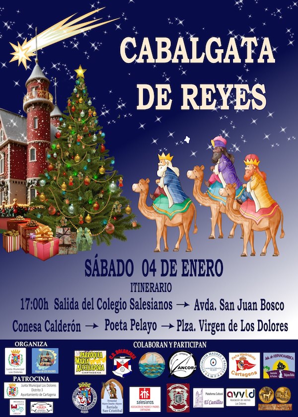 Un buen número de colectivos de Los Dolores, Hispanoamérica, San Cristóbal, Castillitos, Los Jabatos y El Plan se han implicado en la iniciativa que han tenido desde la Junta Vecinal Municipal y la comisión de fiestas de Los Dolores para que uno de los núcleos de población más populosos de Cartagena (su población supera los veinticinco mil vecinos) tengo una cabalgata de Reyes Magos. El recorrido será desde Salesianos hasta la plaza Virgen de los Dolores, pasando por avenida de San Juan Bosco y calles de Conesa Calderón y Poeta Pelayo, apenas kilómetro y medio. La idea inicial es que también pasase por la calle principal de Los Dolores y por San Cristóbal (El Bohío), pero la Policía Local no ha accedido, lo que ha generado mucho malestar entre las asociaciones. Sin embargo, como puntualiza la presidenta de la Junta Vecinal, Julia Otón, "lo importante este año es poner en marcha la cabalgata", indica. Todos los vocales de diferentes partidos políticos de esta institución descentralizadora apoyan y colaboran con la iniciativa.