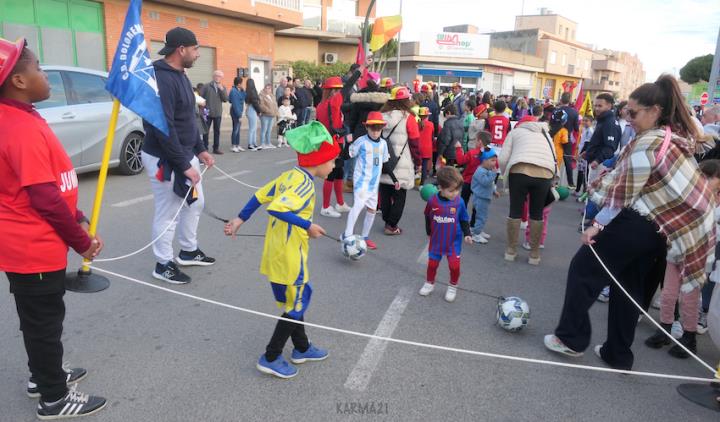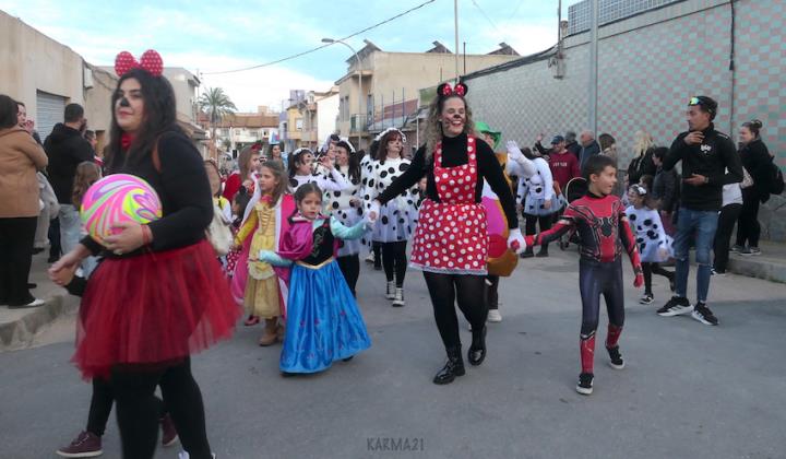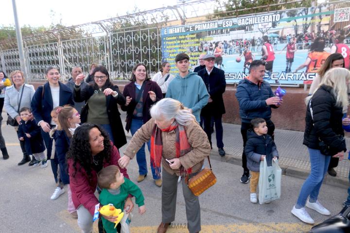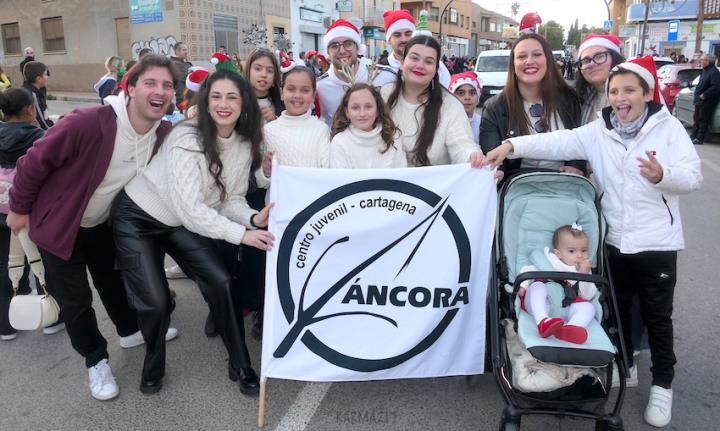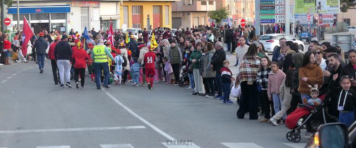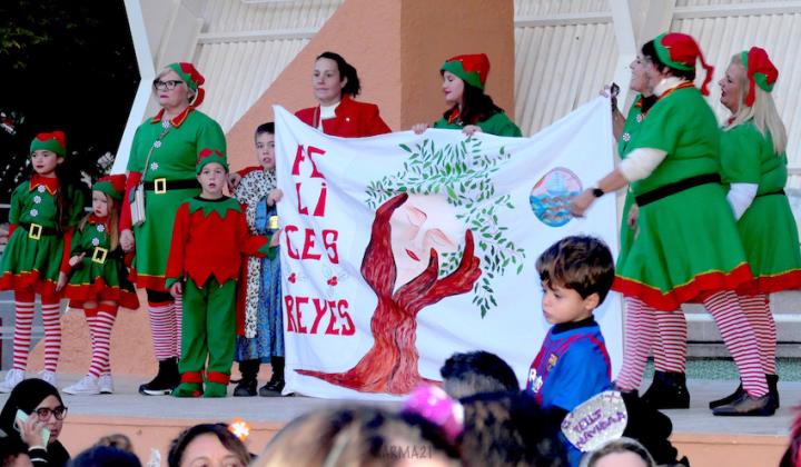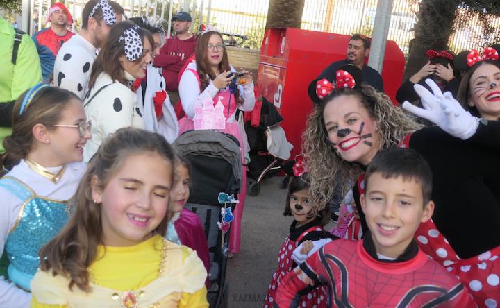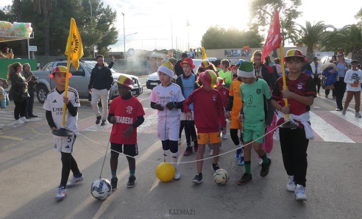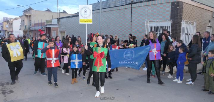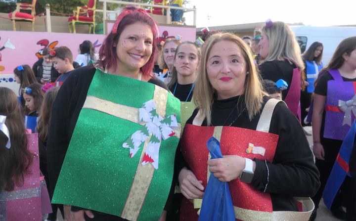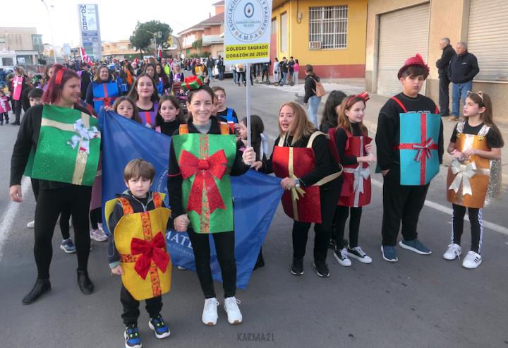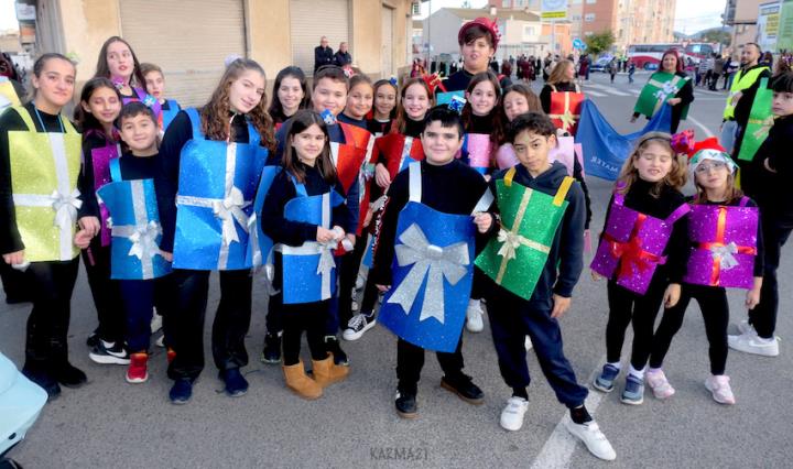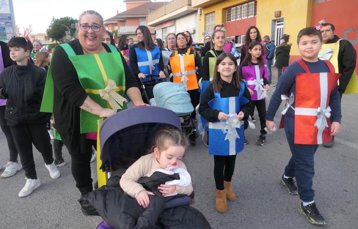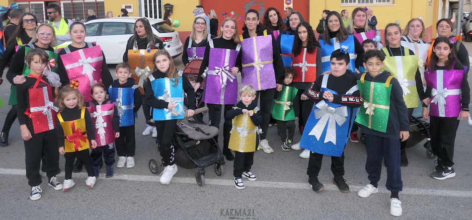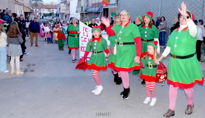 Los primeros eran regalos andantes y los segundos, personajes populares del mundo Disney. Entre ambos marcharon la Escuela de Fútbol del Dolorense, representando la disputa de partidos con balones con cuerda para que no fueran del espacio que ocupaban, y el grupo femenino de Cartagonova y otros colectivos, con disfraces de elfas.