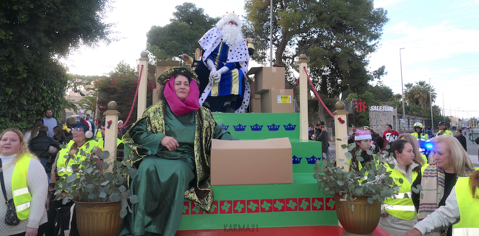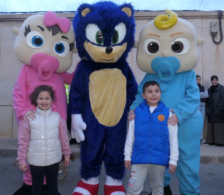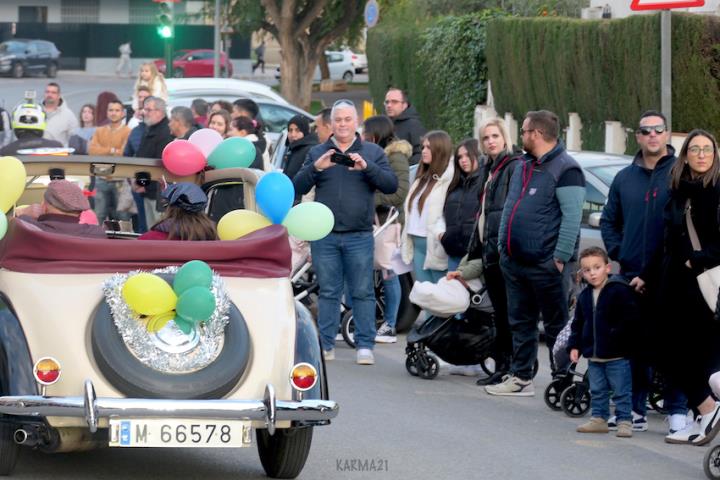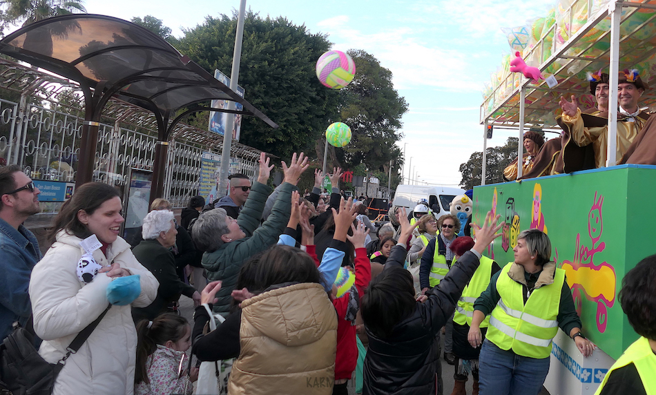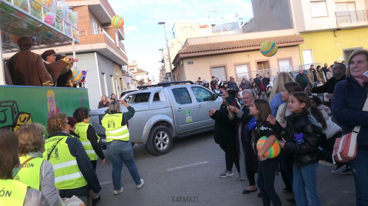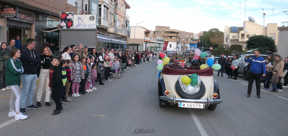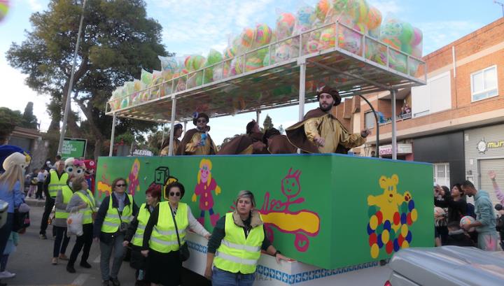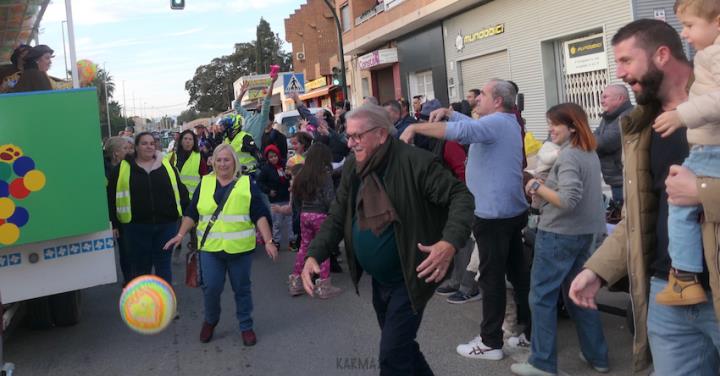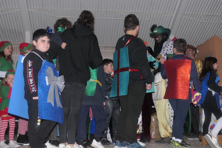 Y llegaron las carrozas. En la primera iban componentes de la Junta Vecinal (vocales de PP, VOX, MC y PSOE) como pajes reales, quienes lanzaron un millar de balones y otro de muñecos. A pie, a continuación, muñecos de populares personajes (numerosos espectadores se fotografiaron con ellos) que llevaban el buzón real para los niños que quería depositar sus cartas. Cerró la carroza de Melchor, Gaspar y Baltasar, desde donde se lanzaban caramelos.