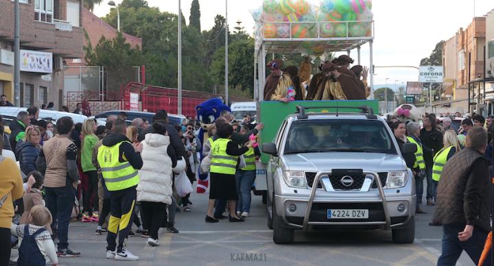 El desfile de Melchor, Gaspar y Baltasar, quienes estuvieron acompañados por moteros, carthagineses, romanos, personajes Disney, muñecos de nieve, regalos móviles y otros disfraces, superó las expectativas con trescientas personas participando en su comitiva ante más de tres mil espectadores