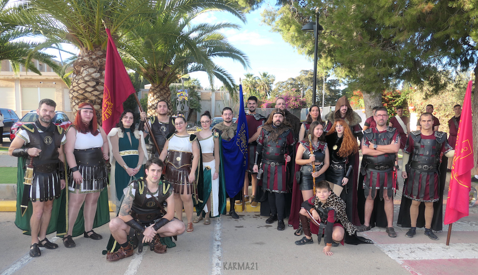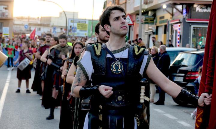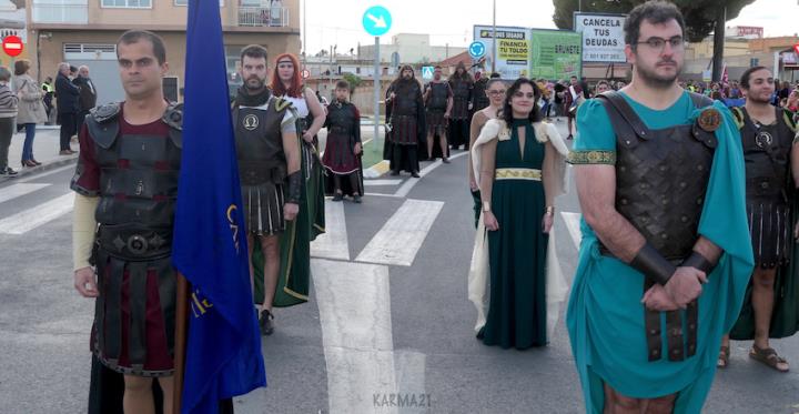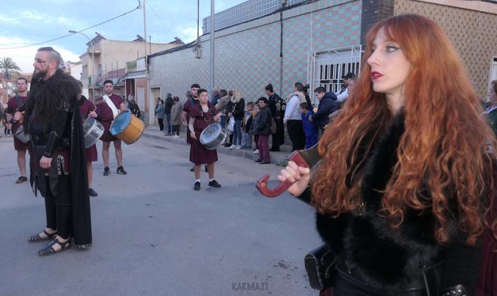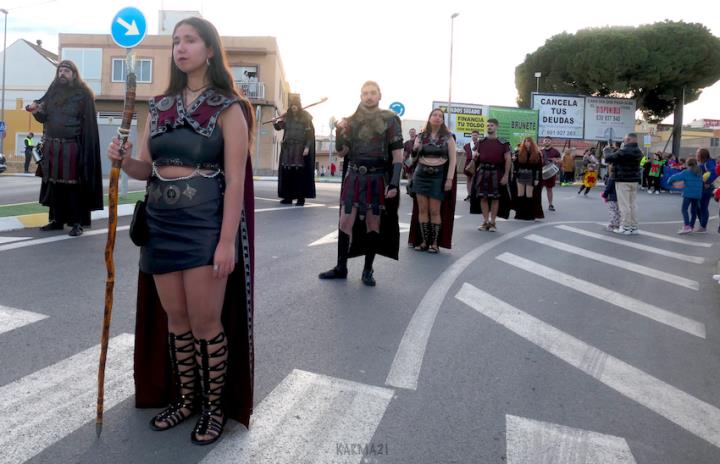 Una escuadra de carthagineses (tropas de Quart-Hadast e Himilcón) y romanos (Adoradores de Venus y Magistrados) iba a continuación de forma marcial al ritmo de su grupo de tambores. Los grupos más numerosos eran los que formaban las AMPAs de los colegios Sagrado Corazón de Jesús (Las Monjas) y Juan Solé (Salesianos).