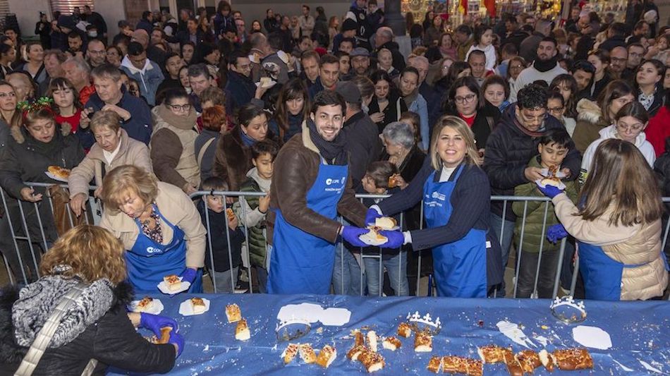 Ayuntamiento y Cope se pusieron el delantal para repartir miles de raciones del roscón de reyes, elaborado por artesanos locales, a las puertas del Palacio Consistorial.