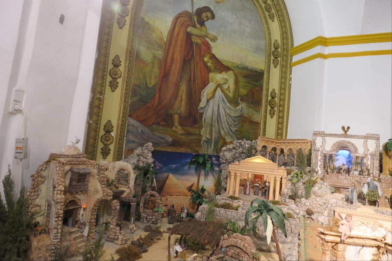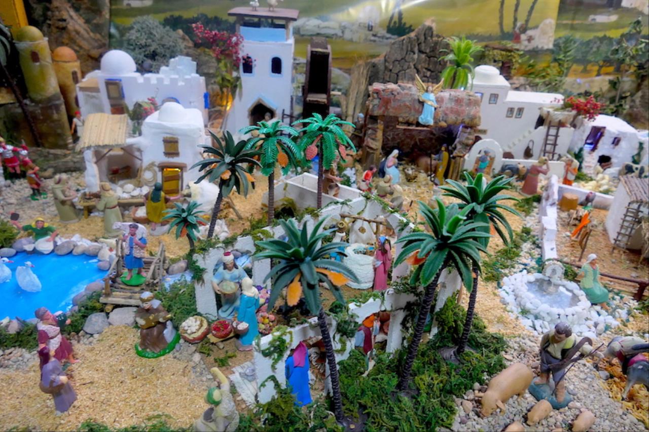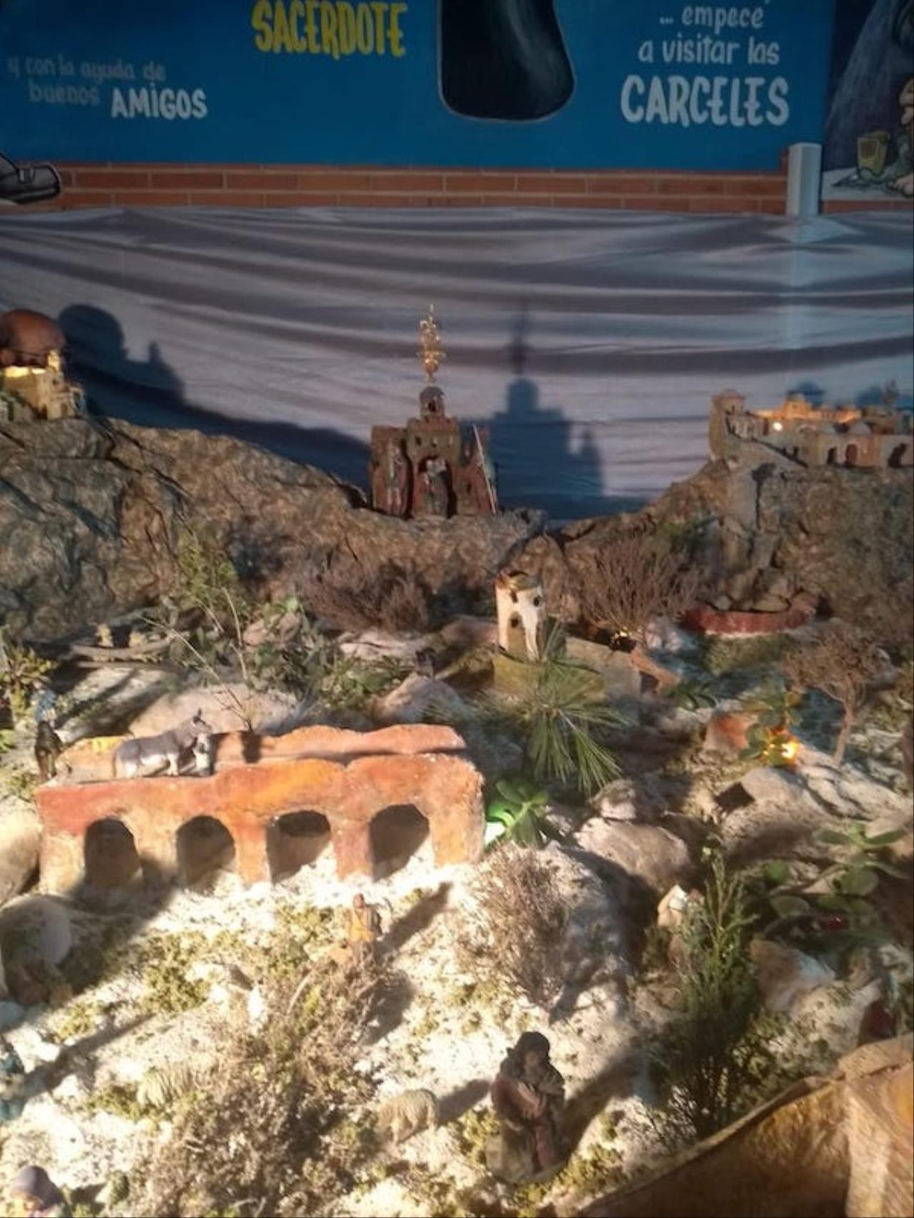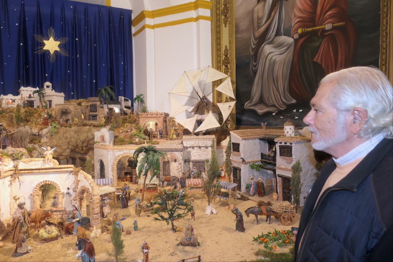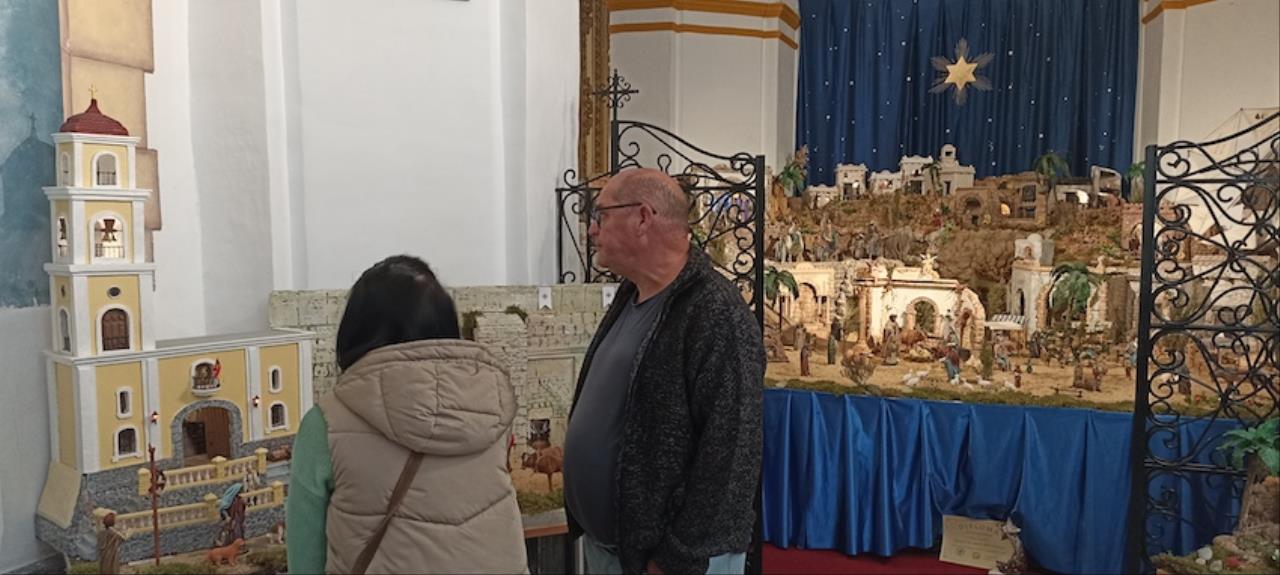 El jurado de la plataforma 'El Castillito' ha acordado también conceder un accésit al gran montaje llevado a cabo en la iglesia de San Antonio Abad, barrio que se sale del área de influencia de Cartagena Norte para premios. El belén ha duplicado este año su tamaño ocupando toda la capilla de San Juan Bautista además de dos extensiones exteriores laterales, una para mostrar el 'Paraíso' con Adán, Eva y la serpiente. “Lo hemos puesto porque es el origen de todo lo que viene después”, explica el párroco, Saúl Sánchez, junto a Antonio Cos y Luis García, los artistas de este enorme nacimiento desde 2024. El otro ala ofrece una reproducción de la iglesia sanantonera, siendo novedad este año que a través de la puerta se puede ver el interior idéntico a como es real. Junto a ella está la Basílica de la Natividad de Belén, levantada en el lugar donde nació Jesus, y que también es novedad en el gran belén. Las figuras que tiene son del prestigioso taller belenista de Griñán (José Antonio y Manuel), en Murcia. Además, lo que es el propio Belén está cargado de detalles, todos con sentido. Las escenas también tienen tienen segundos planos atractivos, como la reacción de ver pasar a los Magos de Oriente con camellos o el juego de la cucaña.
