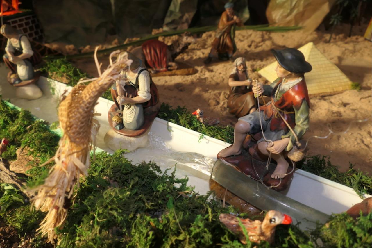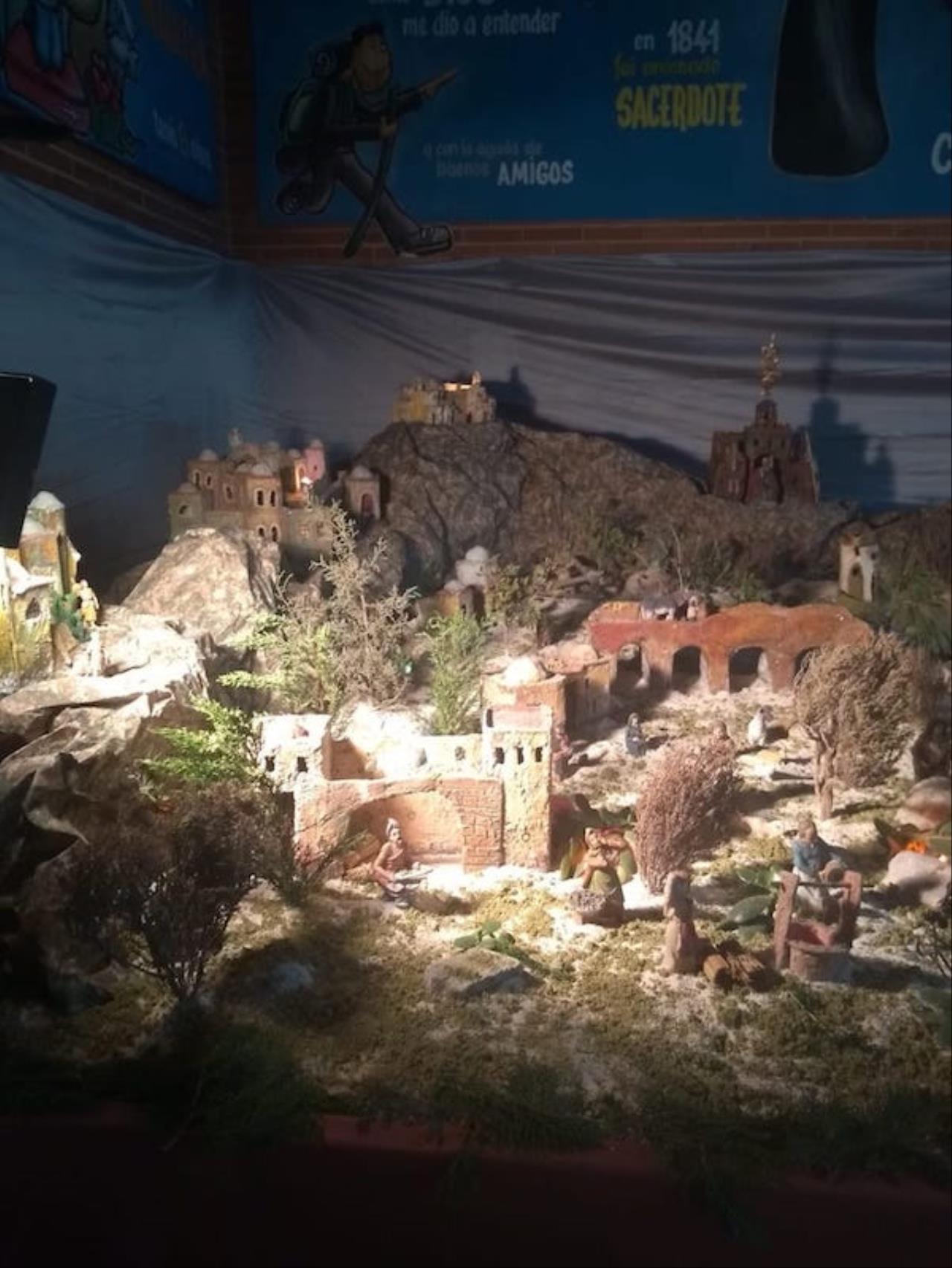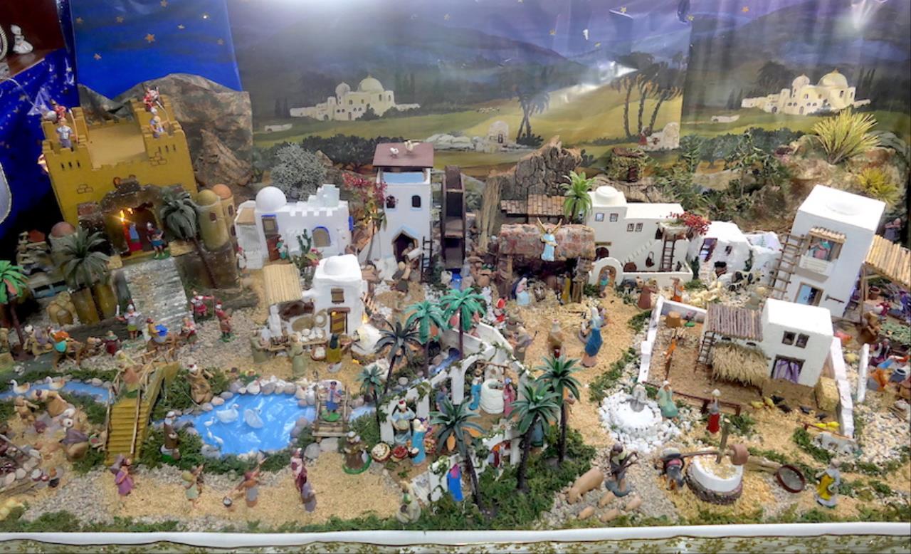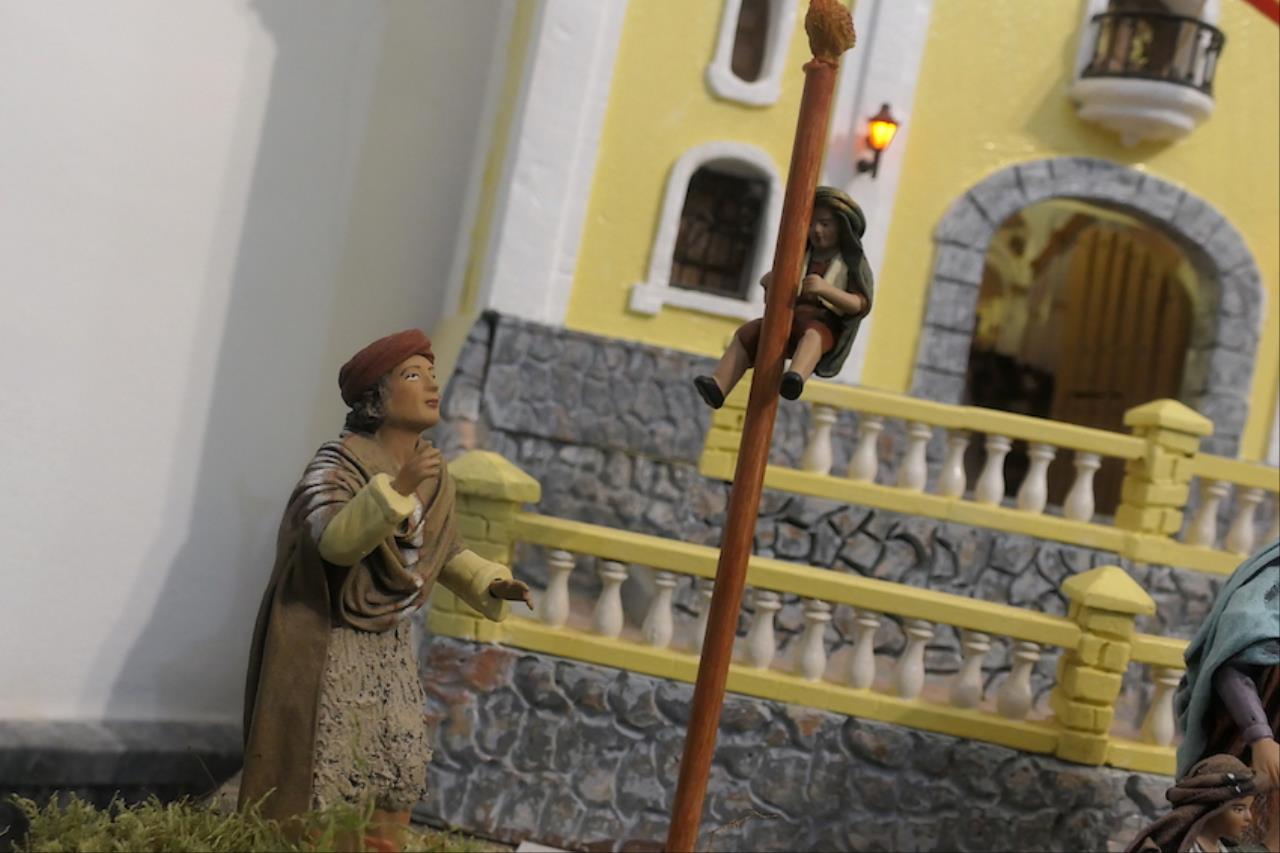 El jurado de la plataforma 'El Castillito' ha acordado también conceder un accésit al gran montaje llevado a cabo en la iglesia de San Antonio Abad, barrio que se sale del área de influencia de Cartagena Norte para premios. El belén ha duplicado este año su tamaño ocupando toda la capilla de San Juan Bautista además de dos extensiones exteriores laterales, una para mostrar el 'Paraíso' con Adán, Eva y la serpiente. “Lo hemos puesto porque es el origen de todo lo que viene después”, explica el párroco, Saúl Sánchez, junto a Antonio Cos y Luis García, los artistas de este enorme nacimiento desde 2024. El otro ala ofrece una reproducción de la iglesia sanantonera, siendo novedad este año que a través de la puerta se puede ver el interior idéntico a como es real. Junto a ella está la Basílica de la Natividad de Belén, levantada en el lugar donde nació Jesus, y que también es novedad en el gran belén. Las figuras que tiene son del prestigioso taller belenista de Griñán (José Antonio y Manuel), en Murcia. Además, lo que es el propio Belén está cargado de detalles, todos con sentido. Las escenas también tienen tienen segundos planos atractivos, como la reacción de ver pasar a los Magos de Oriente con camellos o el juego de la cucaña.