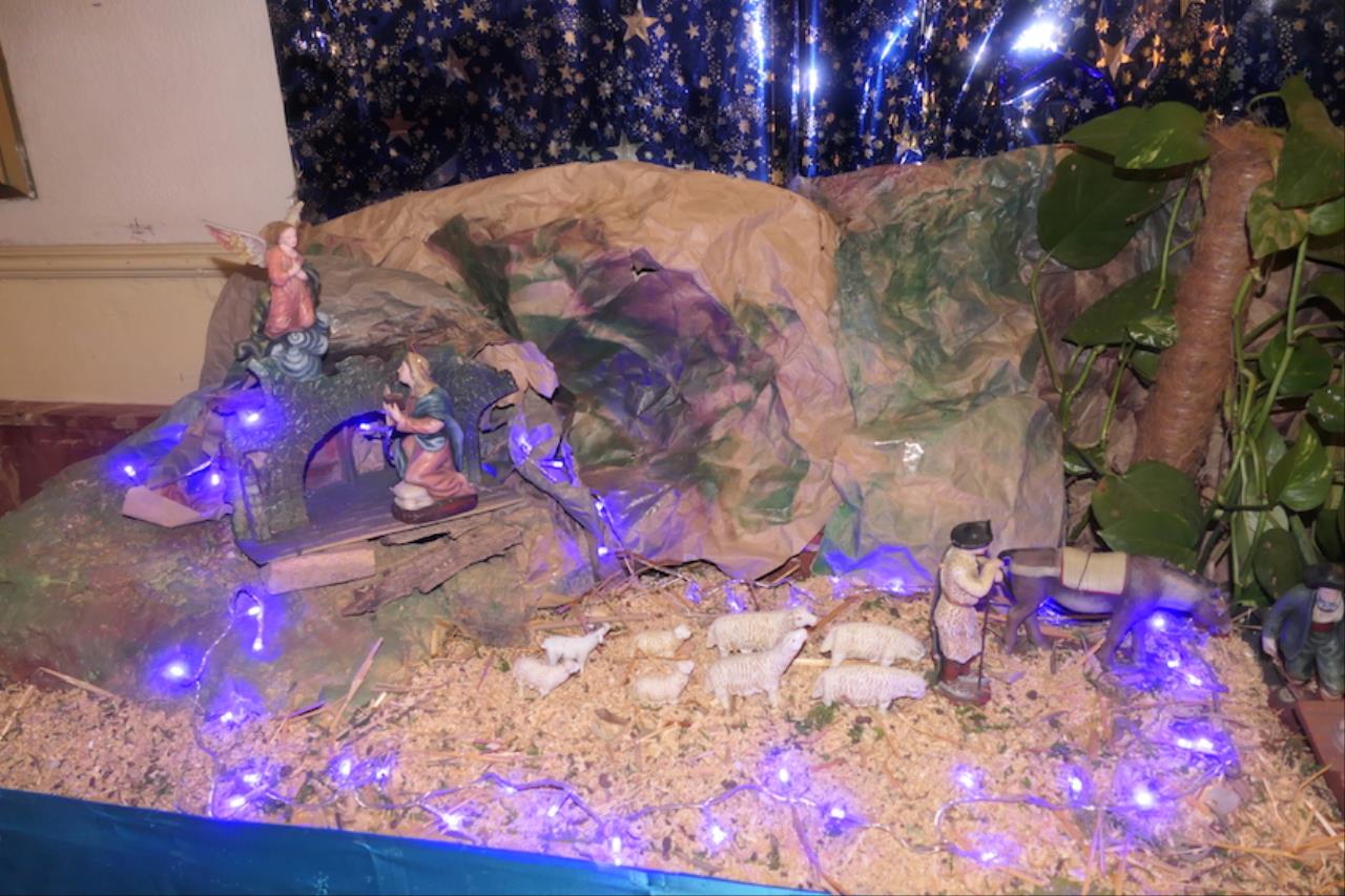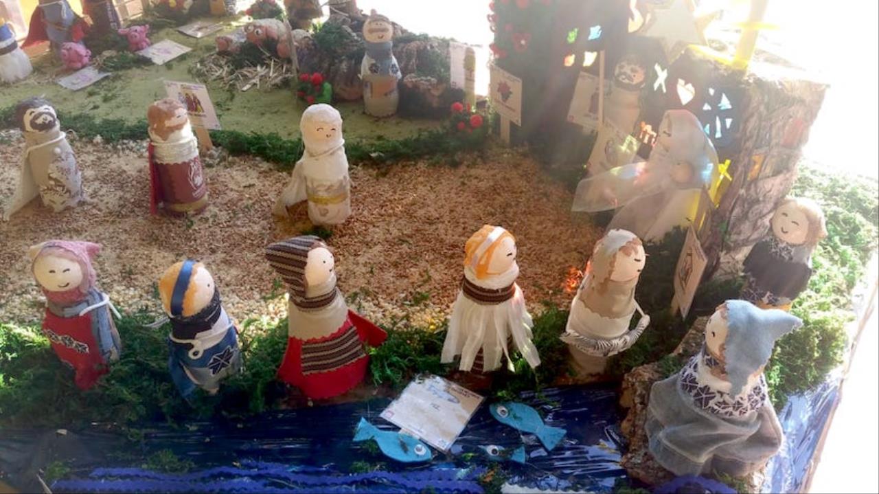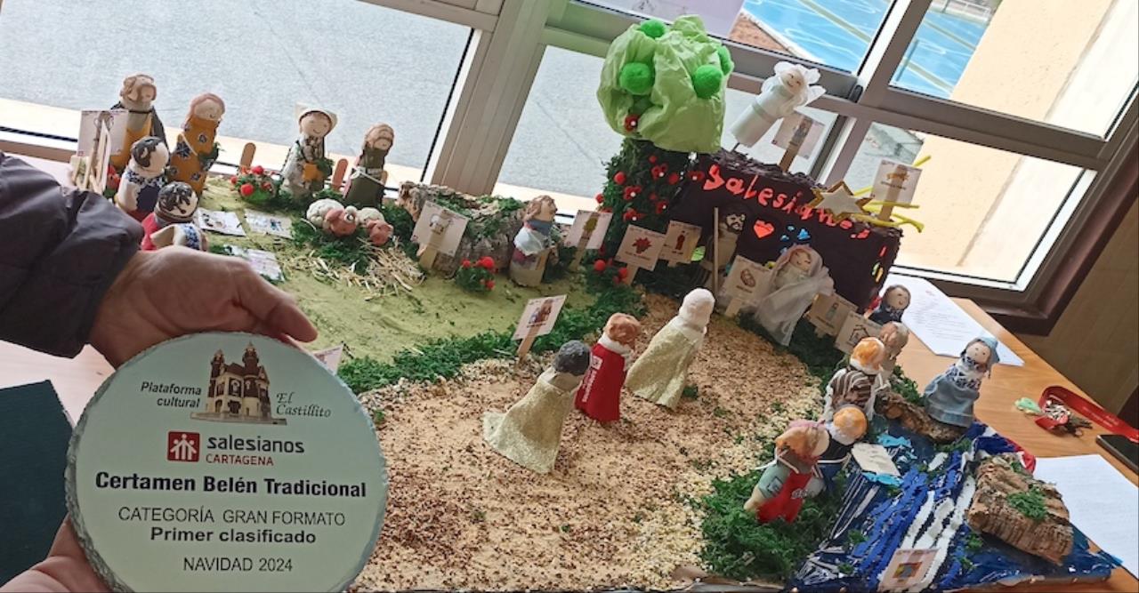 'Belén de los sentidos y las emociones' elaborado en el área de pedagogía terapéutica de la etapa de Primaria por el grupo de habilidades sociales del colegio San Juan Bosco (Salesianos). Los chavales han llevado a cabo un montaje adaptado a las distintas necesidades del alumnado, priorizando la entrada a la información a través del tacto y la vista, por lo que se han utilizado diferentes texturas (corcho, serrín, arena, etc.) y pictogramas, además de tener traducido al sistema Braille todos los textos, por pequeños que sean. Todo el material utilizado es reciclado, como botes de Actimel (para las figuras de personajes) o mascarillas que ya no se usan. "El objetivo es que todos los niños puedan disfrutar el mensaje del Belén, al margen de las características de quien lo observa", indica la profesora, Paqui Noguera, quien también expresa la gratitud del grupo a la colaboración recibida por May (ONCE).