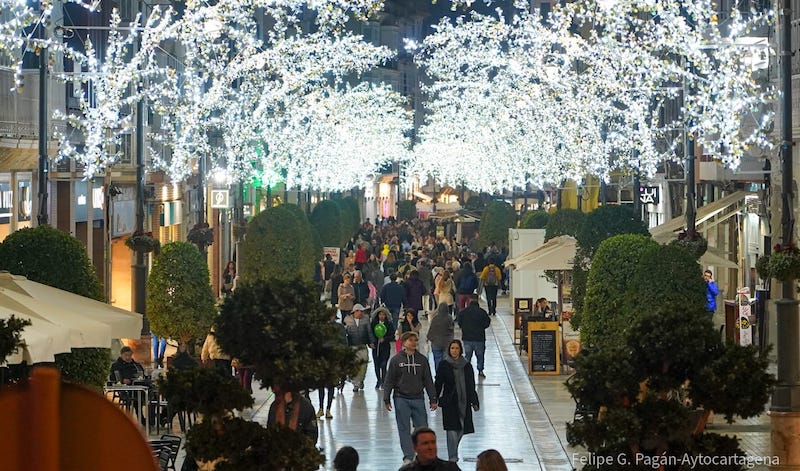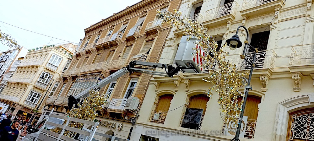 El Ayuntamiento de Cartagena comenzó con la instalación de las luces navideñas por diversos pueblos y barrios de las diputaciones y estos días es cuando se están instalando en el casco histórico de la ciudad.