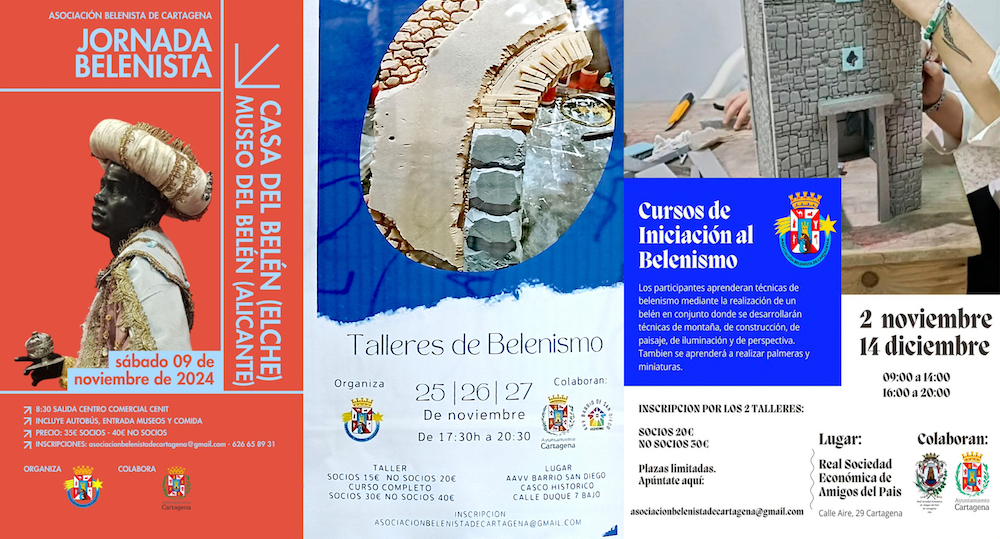 La actividad en torno al mundo del tradicional Belén va a más en Cartagena con la aproximación a las fechas navideñas. Este sábado, la asociación belenista cartagenera partida en una jornada temática de Alicante, del 25 al 27 de este mes se celebrarán talleres de belenismo en Barrio de San Diego y el 14 de diciembre hay curso de iniciación en la Real Sociedad Económica de Amigos del País.
