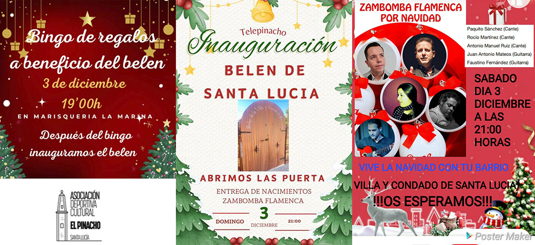 La asociación cultural de la villa y condado de Santa Lucía celebra esta noche (21 horas) la inauguración y encendido del poblado navideño con festival flamenco (con entrada gratuita) y entrega de los 'Nacimientos de honor' a Alberto Requena e Ignacio Jaúdenes, de los nombramientos de madrina (Dolores Terol) y a la 'pastorcilla real' (Cristina Cortado Rodriguez) y de diversos galardones a La Marina, La Verdad, Farmacia de Santa Lucía, José Luis Sánchez, Rosario Ruiz Bujaldón, Francisca Cánovas y Tomás Martínez Pagán. Antes, desde las 19 horas, gran rifa familiar para recoger fondos para los gastos del montaje belenista.