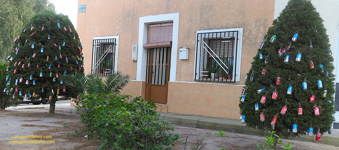 Dos árboles con coloridos botes de bebidas como singulares adornos en la calle Isaac Peral de El Llano del Beal, que han montado vecinos del pueblo.