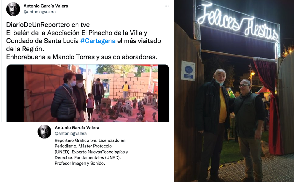El centro territorial de TVE en la Región de Murcia ha ofrecido un reportaje, grabado por el reportero gráfico Antonio García Vera, sobre el poblado navideño que instala cada año la ADC El Pinacho en la plaza de la Marina Española, con un gran Nacimiento automatizado en muchas figuras que ha cumplido tres décadas y que está siendo esta Navidad el más visitado en la Región de Murcia. Además, Jesús Griñán, importante imaginero belenista, ha visitado el montaje, del que califica que es “espectacular”, invitando a todos a acudir a verlo.