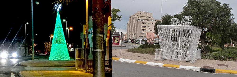 Seguimos recibiendo fotografías de vecinos que quieren resaltar adornos que lucen esta Navidad en sus zonas de residencia, como son los casos del árbol navideño del Barrio de la Concepción y de la caja de regalos de la redonda de Ronda de La Unión, en el Ensanche-Almarjal.
