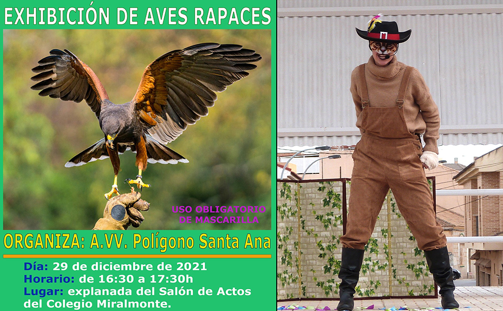 Dos águilas harris, una de origen estadounidense y otra de Perú, y un cernícalo americano protagonizaron la exhibición celebrada en la explanada del colegio Miralmonte, en una tarde en la que cerca de un centenar de personas presenciaron ‘Las aventuras del gato con botas’, dentro de los actos navideños organizados por asociación de vecinos, comisión de fiestas, concejalía de Festejos y la revista ‘El Puente’, en su décimo quinto aniversario.