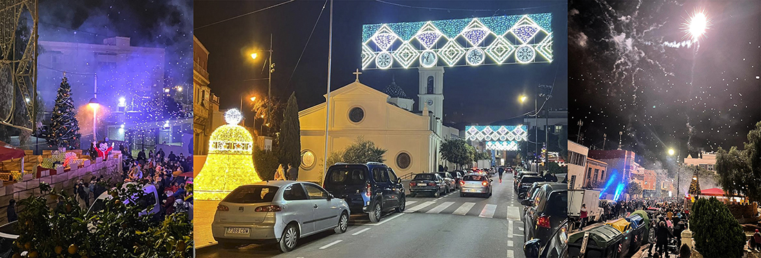 Este año se están multiplicando los adornos de Navidad en las calles del municipio, como en la barriada San Cristóbal, donde es novedad el cartel luminoso de 'Felices fiestas', mientras, árboles adornados 'brotan' en las plaza Alicante y de la barriada de San Ginés, habiendo sido instalados por la concejalía de Festejos.