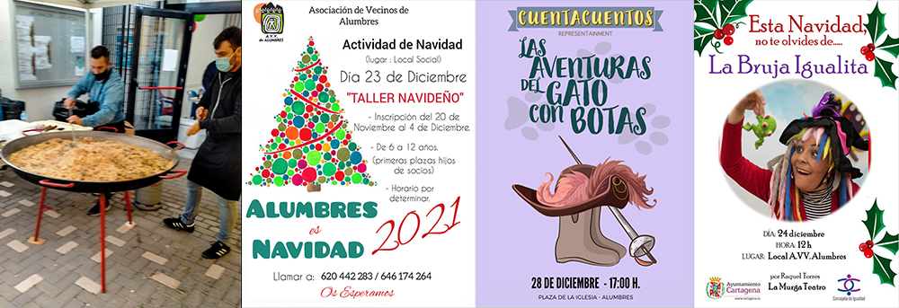 El programa en el municipio de Cartagena, si el clima lo permite, da protagonismo a la música, con la coral polifónica Cartagonova en la iglesia de La Palma, la unión musical Cartagonova y la ASM Santa Cecilia en la plaza de San Francisco. Además, a las 10.45 horas se inaugura el Belén de La Aparecida y una hora más tarde lo hará el Nacimiento de la parroquia del Cristo de la Salud de Los Dolores, barrio donde también ha previsto que tenga lugar un pasacalles navideño. En El Algar se anuncian pasacalles e inauguración del Belén, mientras que Papá Noel transitará en moto por Los Urrutias. En La Puebla actuará el concierto Adrián Ruiz (16 horas), mientras que hay pasacalles en La Aparecida y trenecito gua-gua en El Albujón. En Ciudad Jardín acaban las jornadas de ‘Vida de barrio’.